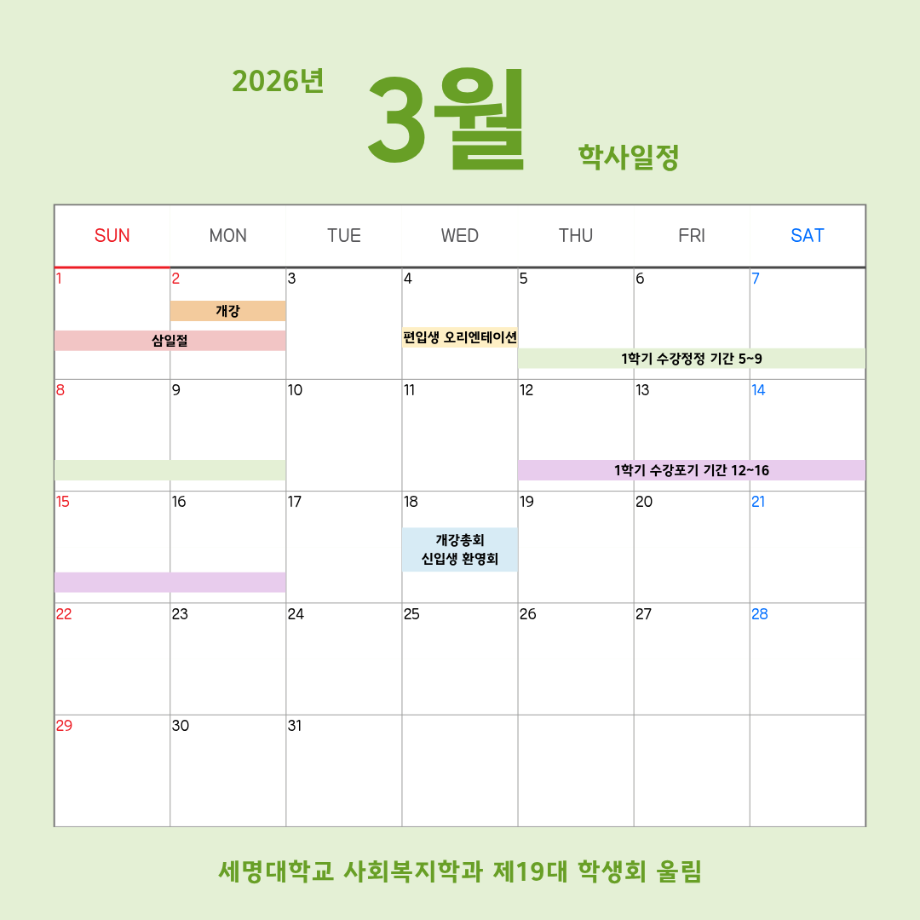 본문 시작 홈으로 커뮤니티 학과소개 교수소개 교육과정 현장실습 및 취업정보 커뮤니티 홈페이지가이드 학사일정 학과공지 학사일정 학생회 동아리 학생 소통 광장 포토갤러리 전공자료실 서식자료실 학사일정 페이스북 트위터 프린트 3월 학사 일정 사회복지학과 184 2026-03-04 3월 학사 일정입니다. 목록 이전2월 학사 일정 담당부서 : 사회복지학과 담당자 : - 연락처 : 043-649-1799 최종수정일 : 2024-10-26 만족도조사 만족도 조사 이 페이지에서 제공하는 정보에 대하여 만족하시나요? 매우만족 만족 보통 불만족 매우불만족