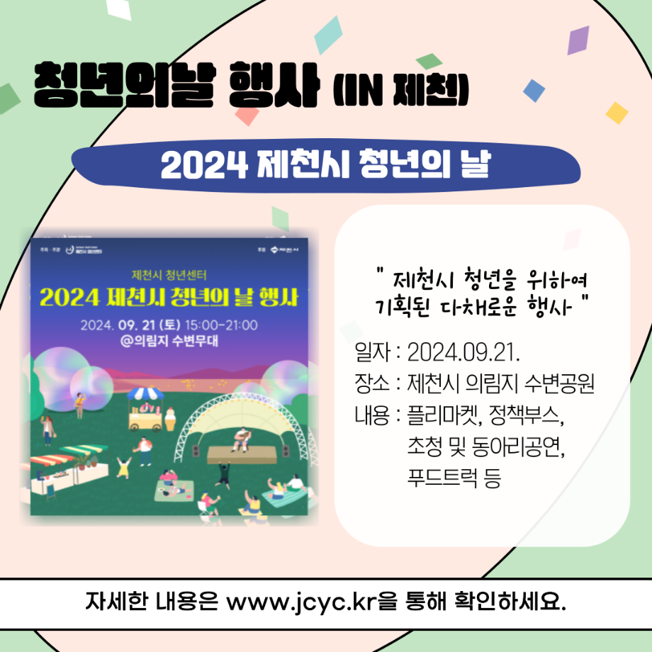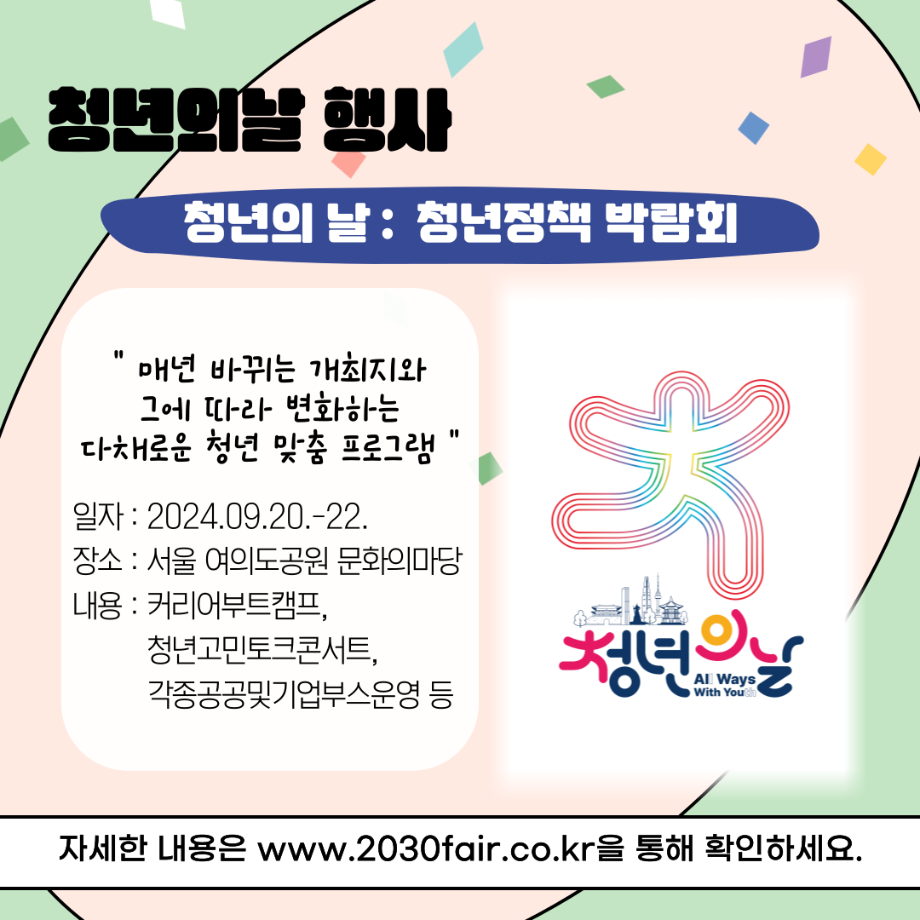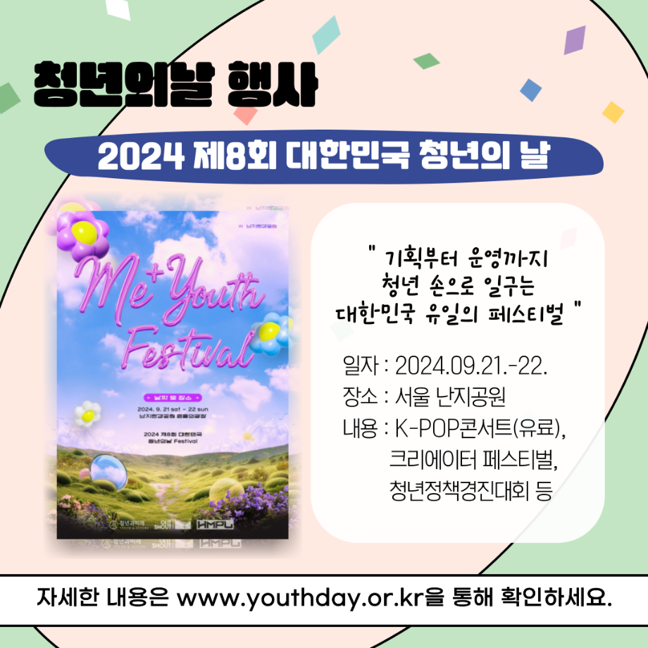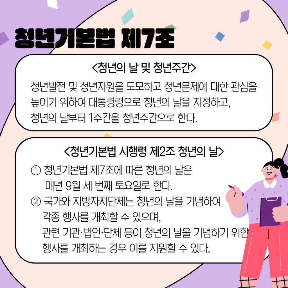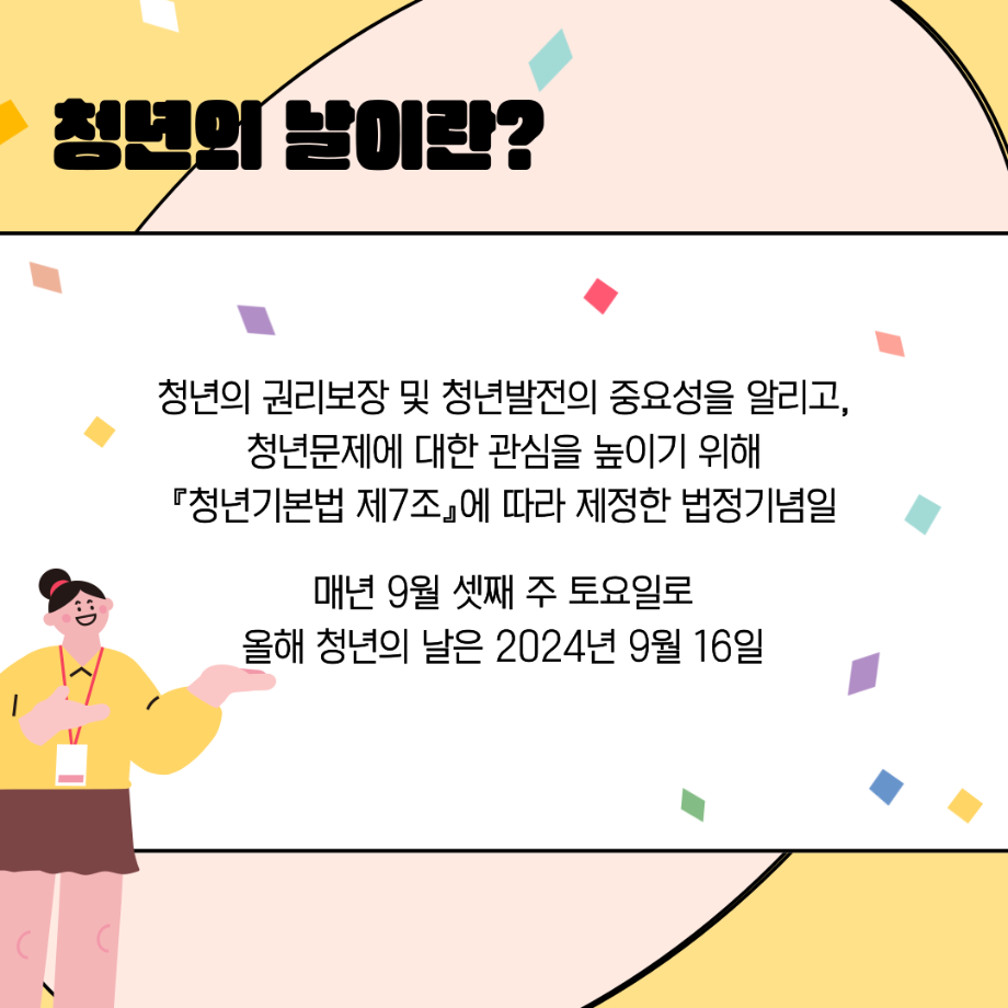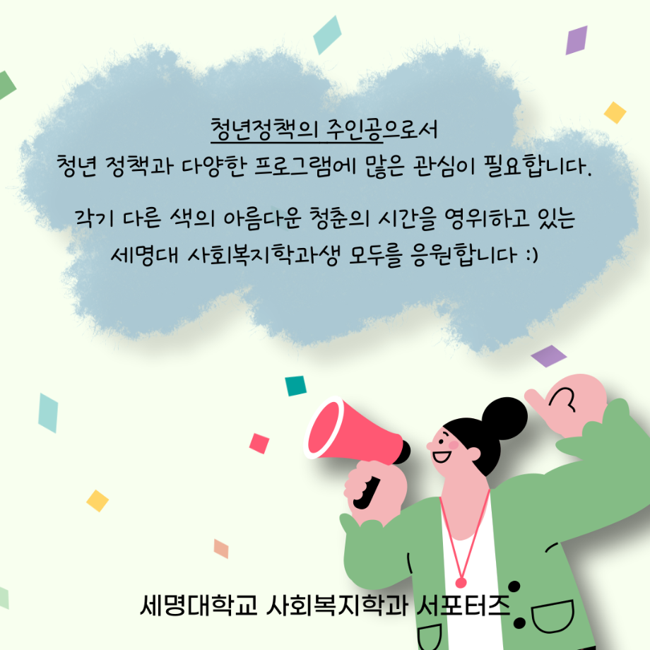 본문 시작 홈으로 커뮤니티 학과소개 교수소개 교육과정 현장실습 및 취업정보 커뮤니티 홈페이지가이드 학생 소통 광장 학과공지 학사일정 학생회 동아리 학생 소통 광장 포토갤러리 전공자료실 서식자료실 학생 소통 광장 페이스북 트위터 프린트 세명대학교 사회복지학과 청년의 날 홍보 사회복지학과 3058 2024-09-21 매년 9월 셋째주 토요일은 『청년기본법 제7조』에 따라 청년의 권리 증진과 문제 해결을 통한 발전을 위해 제정된 '청년의날'입니다 🎉 다양한 청년 정책이 개발되고 발전할 수 있도록 많은 관심이 필요합니다. 목록 이전세명대학교 사회복지학과 아쉬움이 남는다면 Right now 다음 세명대학교 사회복지학과 2025 교환학생 궁금하다면? 담당부서 : 사회복지학과 담당자 : - 연락처 : 043-649-1799 최종수정일 : 2024-10-26 만족도조사 만족도 조사 이 페이지에서 제공하는 정보에 대하여 만족하시나요? 매우만족 만족 보통 불만족 매우불만족