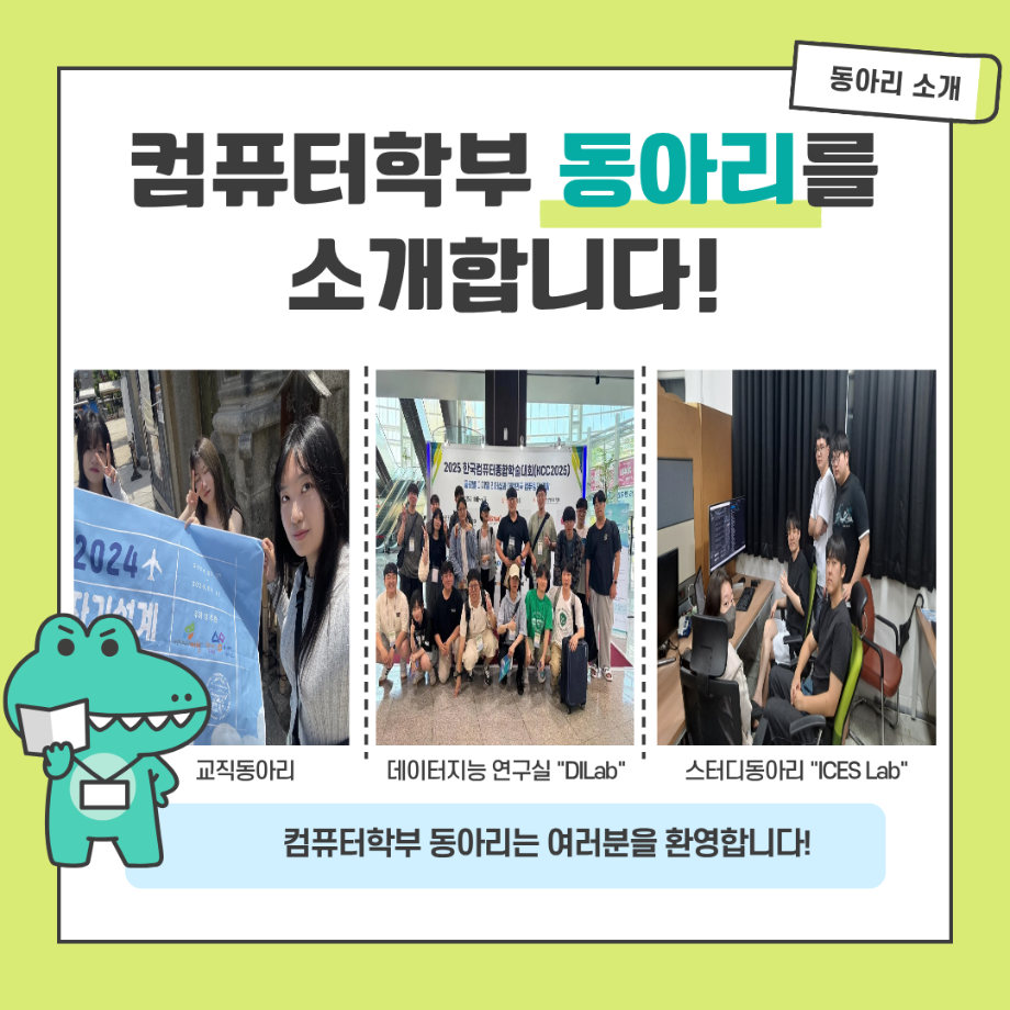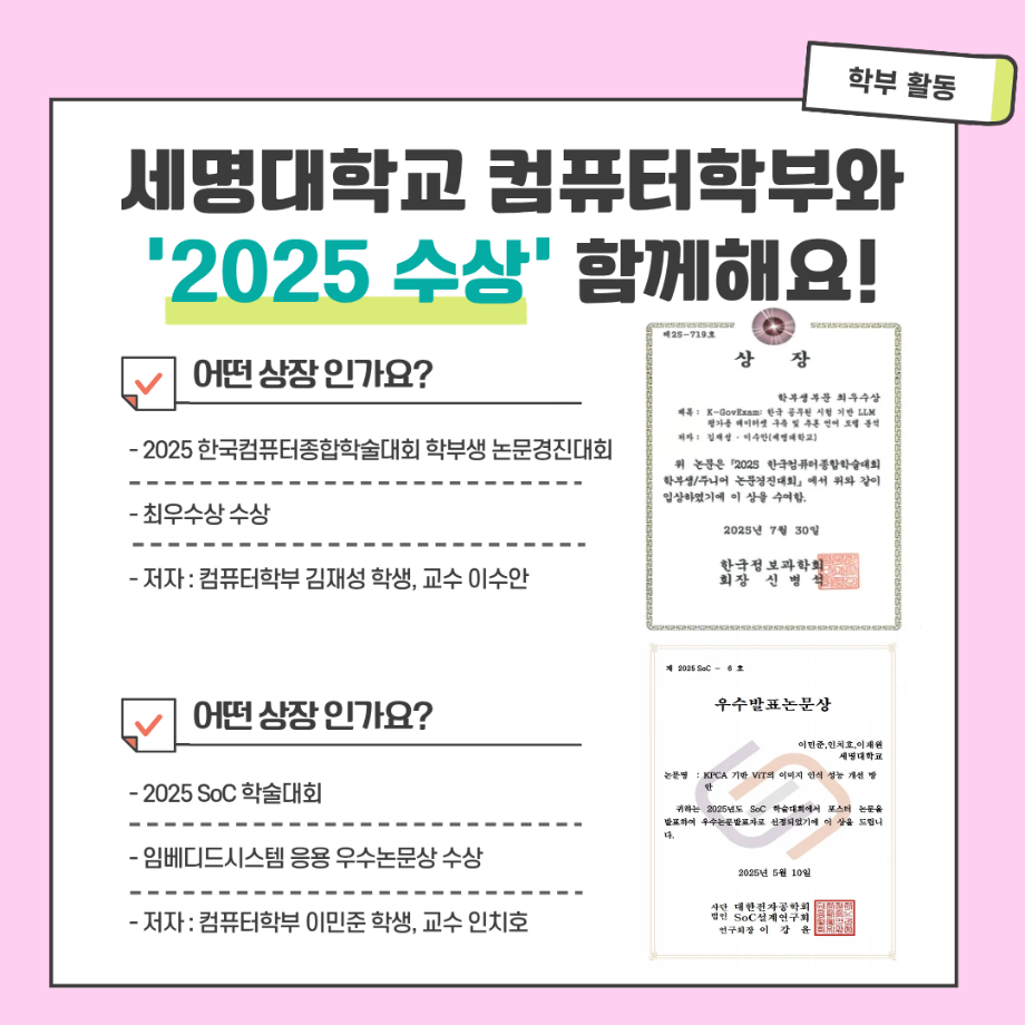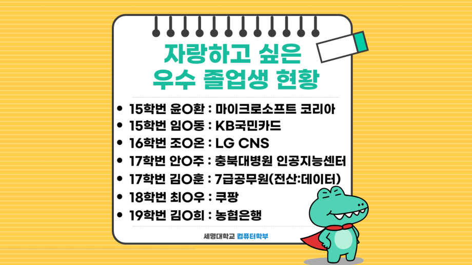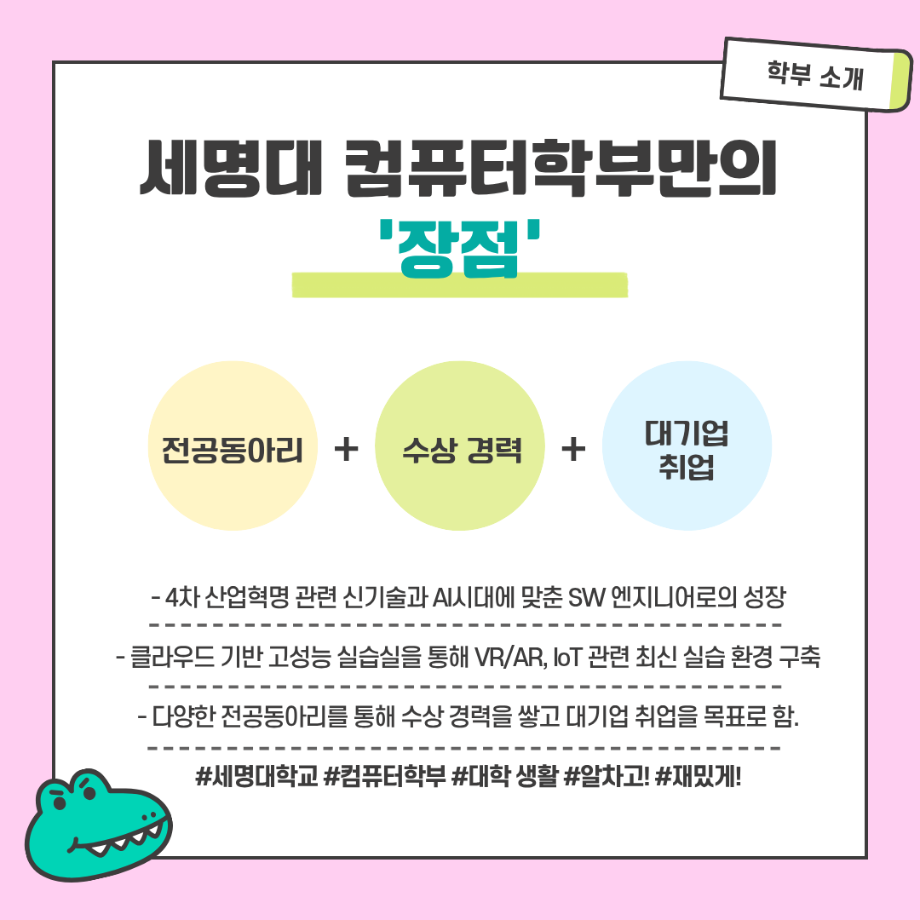 본문 시작 홈으로 학부활동 학부소개 학부활동 교육과정 커뮤니티 학부생활 입학안내 홈페이지가이드 학부갤러리 학부행사 학생회 활동 전공 동아리 학부갤러리 학부갤러리 페이스북 트위터 프린트 컴퓨터학부 소개 전체관리자 1499 2025-09-01 세명대학교 컴퓨터학부 소개 목록 이전세명대 컴퓨터학부 송유정 교수, 제주 유광농장과 함께 제천에 따뜻한 나눔 전하다 다음 2026학년도 수시모집 주요사항 담당부서 : 컴퓨터학부 담당자 : - 연락처 : 043-649-1272 최종수정일 : 2024-10-26 만족도조사 만족도 조사 이 페이지에서 제공하는 정보에 대하여 만족하시나요? 매우만족 만족 보통 불만족 매우불만족