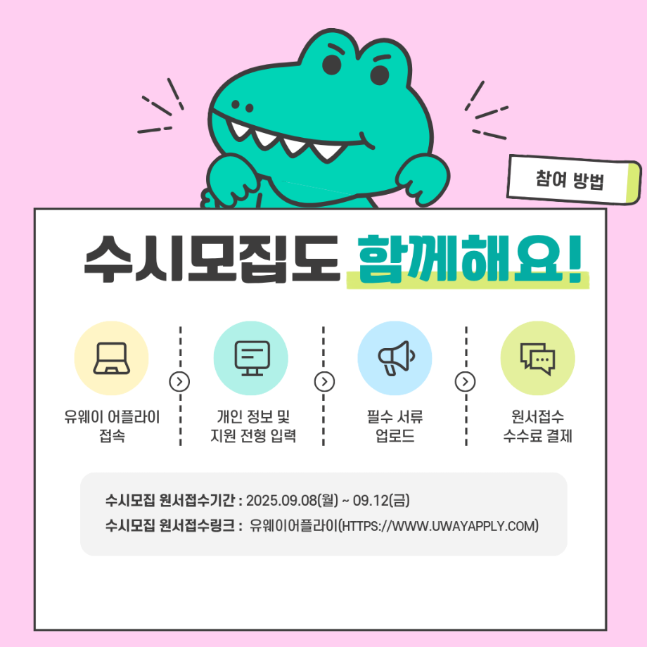입시생을 위한 링크서비스 입학안내 수시모집 정시모집 편입학 Q&A 학과안내 성적자동산출 입시자료신청 대학소개 장학제도 >학생생활관(기숙사) >찾아오시는길 캠퍼스투어 >국제교류 >학군단(ROTC) >통학버스 입시생 레이어 닫기