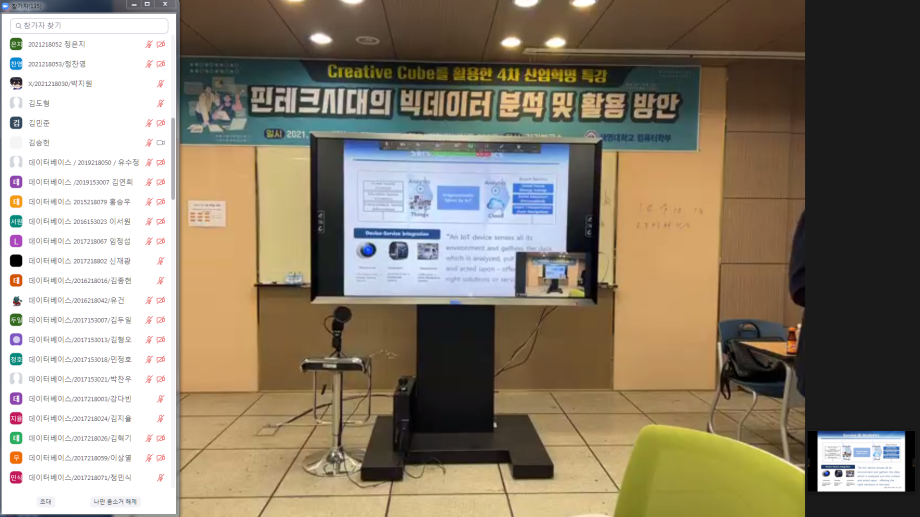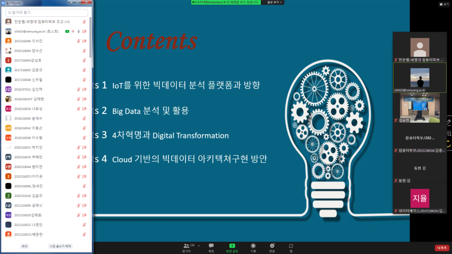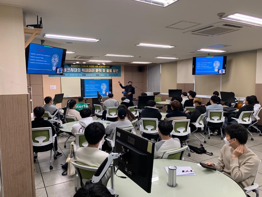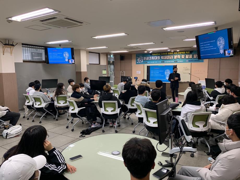 본문 시작 홈으로 학부활동 학부소개 학부활동 교육과정 커뮤니티 학부생활 입학안내 홈페이지가이드 학부갤러리 학부행사 학생회 활동 전공 동아리 학부갤러리 학부갤러리 페이스북 트위터 프린트 Creative Cube 를 활용한 4차 산업혁명 특강 컴퓨터학부 3546 2021-11-09 컴퓨터학부에서는 21.11.09(화) Creative Cube(첨단관 322호)에서 핀테크시대의 빅데이터 분석 및 활용 방안 - 교양대학 김기복 강사 의 주제로 Creative Cube 를 활용한 4차 산업혁명 특강을 진행하였습니다. 이번 특강은 대면특강 과 동시에 ZOOM을 활용한 실시간 송출을 진행하였으며 학부 학생 140명 가량이 참가하였고 성공적으로 마무리하였습니다. 목록 이전2021 한국컴퓨터종합학술대회 입상 다음 컴퓨터실무활용능력 자격증 특강 진행 담당부서 : 컴퓨터학부 담당자 : - 연락처 : 043-649-1272 최종수정일 : 2024-10-26 만족도조사 만족도 조사 이 페이지에서 제공하는 정보에 대하여 만족하시나요? 매우만족 만족 보통 불만족 매우불만족