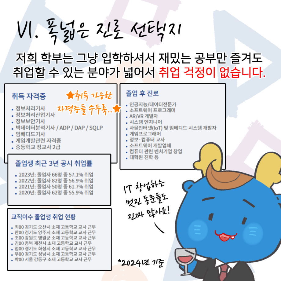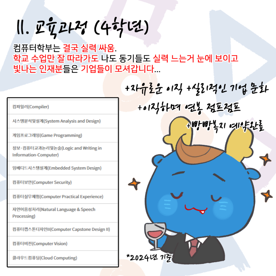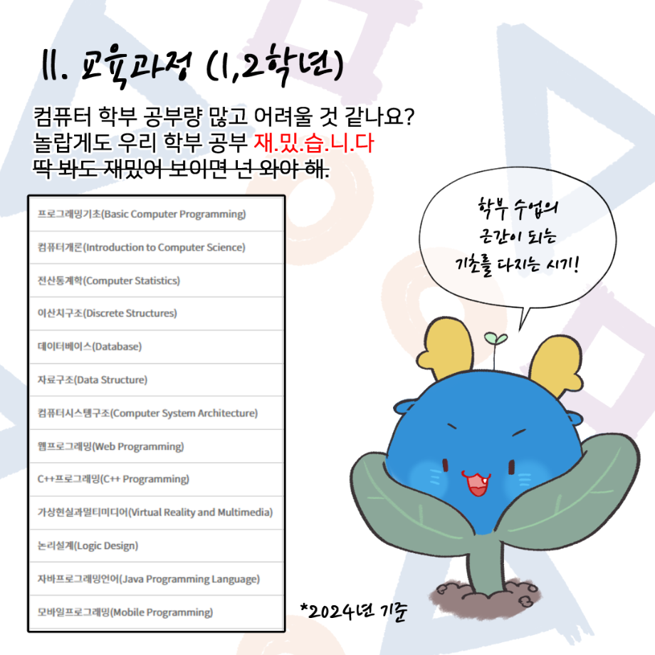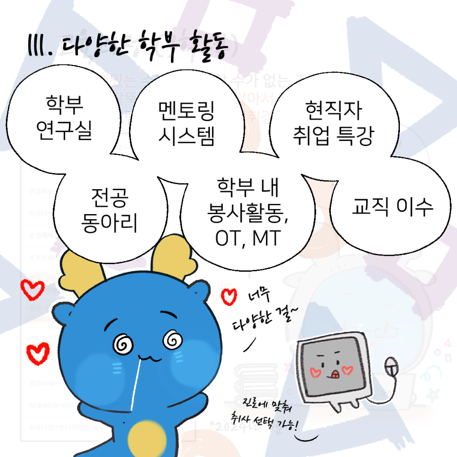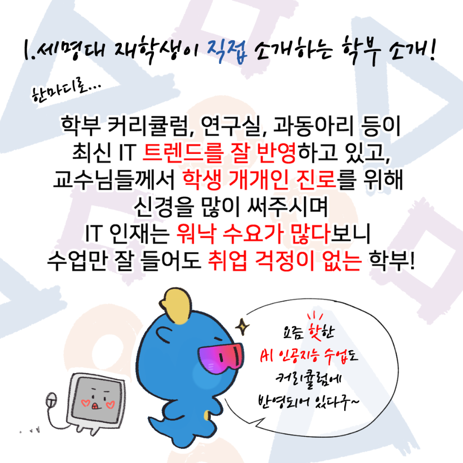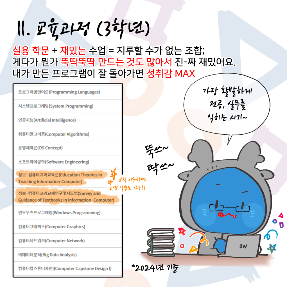 본문 시작 홈으로 학부활동 학부소개 학부활동 교육과정 커뮤니티 학부생활 입학안내 홈페이지가이드 학부갤러리 학부행사 학생회 활동 전공 동아리 학부갤러리 학부갤러리 페이스북 트위터 프린트 세명대학교 컴퓨터학부 소개 인스타툰 컴퓨터학부 2582 2024-11-25 안녕하세요. 컴퓨터학부 학생, 교직원 여러분. 컴퓨터학부의 이서진 학생이 우리 세명대학교 컴퓨터학부를 소개하는 인스타툰 (Instagram + Cartoon) 을 그려주셨어요! 세명대학교 재학생이 직접 소개하는 학부 소개부터 1학년부터 4학년까지의 교육과정, 현직자 취업 특강, 멘토링 시스템 등의 다양한 학부 활동과 교수님 소개 등, 귀엽고 개성있는 그림체로 우리 학부를 잘 소개시켜 주셨습니다~ 감사합니다! 목록 이전대학생이라면 알아둬야 하는 저작권 의식 안내 다음 청소년 빅콘서트 및 전공체험 프로그램 부스 운영 담당부서 : 컴퓨터학부 담당자 : - 연락처 : 043-649-1272 최종수정일 : 2024-10-26 만족도조사 만족도 조사 이 페이지에서 제공하는 정보에 대하여 만족하시나요? 매우만족 만족 보통 불만족 매우불만족