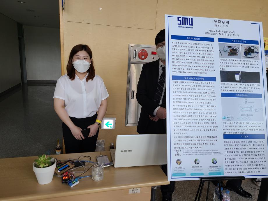 본문 시작 홈으로 SMIT 소식 SMIT 소개 SMIT 교육 SMIT 취업 SMIT 소식 SMIT 입학 홈페이지가이드 경진대회 공지사항 갤러리 경진대회 동아리 경진대회 페이스북 트위터 프린트 2021 캡스톤디자인 장려상 아두이노 습도센서를이용한식물케어 스마트IT학부 4408 2021-09-01 장려상 - 작품명 : 아두이노 습도센서를이용한식물케어 - 지도교수 : 오선진 - 팀원 : 심은송, 이재준, 한소연 코로나19 여파로 ‘집콕족'이 증가하면서 집에서 하는 홈가드닝의 초보자들을 위한 제품을 고안해냈다. 처음 식물을 키우게 되는 초보자들을 위해 센서를 이용하여 앱으로 받아보며 쉬운 식물관리를 도와줄 수 있는 제품을 개발하였다. 목록 이전2020-06-17 온라인 캡스톤디자인 경진대회 다음 2021 캡스톤디자인 장려상 LoRa를 이용한 킥보드 공유서비스 담당부서 : 스마트IT학부 담당자 : - 연락처 : 043-649-1275 최종수정일 : 2024-10-26 만족도조사 만족도 조사 이 페이지에서 제공하는 정보에 대하여 만족하시나요? 매우만족 만족 보통 불만족 매우불만족