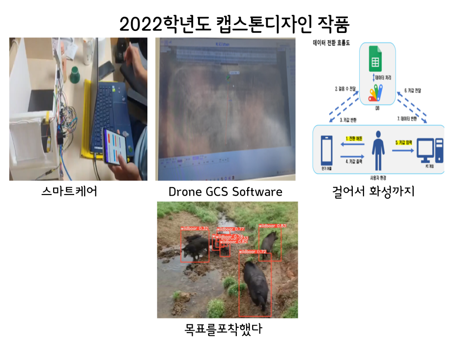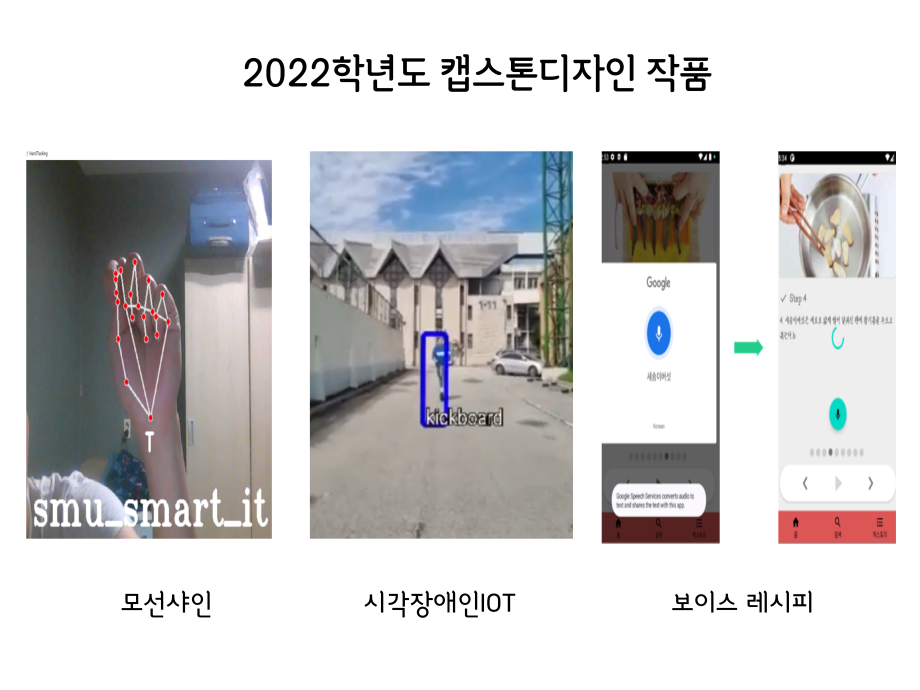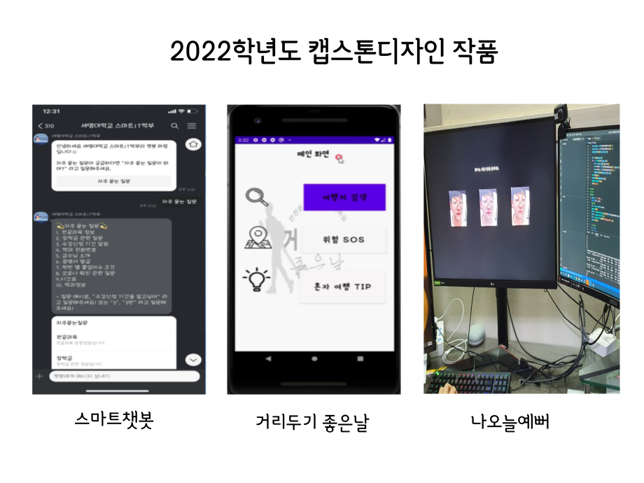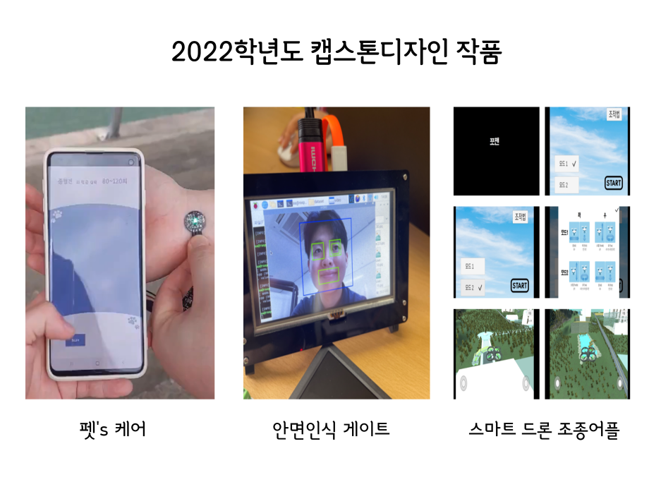 본문 시작 홈으로 SMIT 소식 SMIT 소개 SMIT 교육 SMIT 취업 SMIT 소식 SMIT 입학 홈페이지가이드 경진대회 공지사항 갤러리 경진대회 동아리 경진대회 페이스북 트위터 프린트 2022학년도 캡스톤디자인 작품 스마트IT학부 2871 2022-06-02 2022년 06월 2일 스마트IT학부는 캡스톤디자인 경진대회를 학술관1층 로비에서 진행하였습니다. 4학년 재학생들이 4년동안 학습한 지식의 마무리 단계로서 1년 동안 준비한 작품을 교수님들께 설명과 함께 시연하고 교수님들의 평가 후 우수작품을 선정하여 학술관112호에서 시상하였습니다. 캡스톤디자인 결과발표회를 통해서 재학생들은 산업현장에서 진행해야 하는 프로젝트 업무를 간접적으로 느낄 수 있는 뜻 깊은 자리 였습니다. 목록 이전2021.06.10 제22회 캡스톤디자인 전시회 다음 2022 캡스톤디자인 장려상 모션사인 담당부서 : 스마트IT학부 담당자 : - 연락처 : 043-649-1275 최종수정일 : 2024-10-26 만족도조사 만족도 조사 이 페이지에서 제공하는 정보에 대하여 만족하시나요? 매우만족 만족 보통 불만족 매우불만족