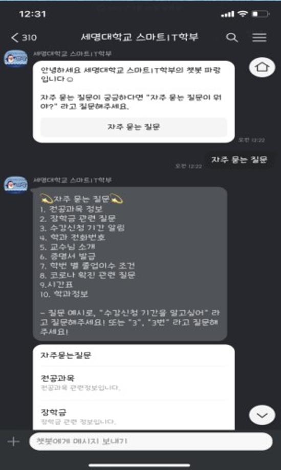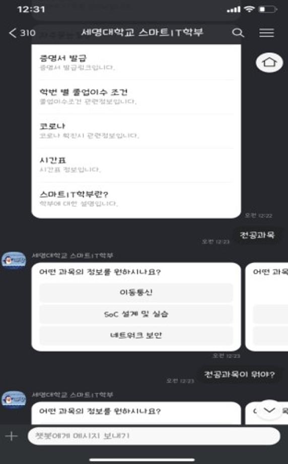 본문 시작 홈으로 SMIT 소식 SMIT 소개 SMIT 교육 SMIT 취업 SMIT 소식 SMIT 입학 홈페이지가이드 경진대회 공지사항 갤러리 경진대회 동아리 경진대회 페이스북 트위터 프린트 2022 캡스톤디자인 최우수상 스마트챗봇 스마트IT학부 8219 2022-06-02 최우수상 - 작품명 : 스마트챗봇 - 지도교수 : 송미화 - 팀원 : 김도연, 서황희, 황태현, 이영건 다수의 사용자들을 동시에 응대하는 다중처리성과 즉각 반응하는 실시간성 등 여러 장점을 갖춘 챗봇을 대다수의 학부생들이 이용하고 있고, 간단하게 접근 가능한 카카오톡에 연동시켜 개발하였다. 목록 이전2022 캡스톤디자인 우수상 Drone GCS Software 다음 멀티모달 기반 인공감성지능 모델 개발 담당부서 : 스마트IT학부 담당자 : - 연락처 : 043-649-1275 최종수정일 : 2024-10-26 만족도조사 만족도 조사 이 페이지에서 제공하는 정보에 대하여 만족하시나요? 매우만족 만족 보통 불만족 매우불만족