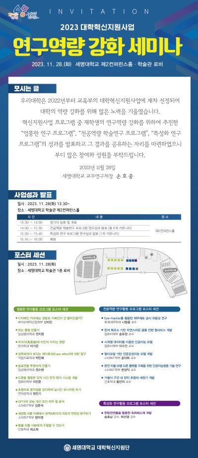 23.11.28(화) 학술관 로비 및 제2컨퍼러스 홀에서 교수-학생이 연구 커뮤니티를 구성하여 전공 관련 주제를 설정하고, 연구를 수행하는 "전공역량 강화 프로그램"이 시행 되었습니다.