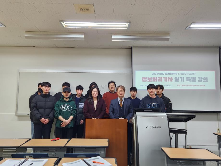본문 시작 홈으로 SMIT 소식 SMIT 소개 SMIT 교육 SMIT 취업 SMIT 소식 SMIT 입학 홈페이지가이드 갤러리 공지사항 갤러리 경진대회 동아리 갤러리 페이스북 트위터 프린트 S-Boot Camp 정보처리기사 실기 특강 스마트IT학부 3836 2023-11-29 스마트IT학부는 4학년 재학생들을 대상으로 첨단정보학관 402호에서 2023.11.01(수), 08(수), 15(수), 22(수) 총 4주 동안 S-Boot Camp 정보처리기사 실기 특강을 시행했습니다. S-Boot Camp 정보처리기 실기 특강으로 학생들의 직무 역량을 강화할 수 있는 유익한 시간이었습니다. 목록 이전📌 잊지 말고! 수시 최초합격자 등록하자!! 다음 📌 2024학년도 세명대 정시 모집요강 안내 📌 담당부서 : 스마트IT학부 담당자 : - 연락처 : 043-649-1275 최종수정일 : 2024-10-26 만족도조사 만족도 조사 이 페이지에서 제공하는 정보에 대하여 만족하시나요? 매우만족 만족 보통 불만족 매우불만족