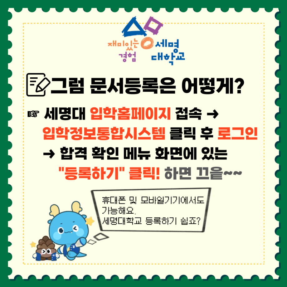 본문 시작 홈으로 SMIT 소식 SMIT 소개 SMIT 교육 SMIT 취업 SMIT 소식 SMIT 입학 홈페이지가이드 갤러리 공지사항 갤러리 경진대회 동아리 갤러리 페이스북 트위터 프린트 2025학년도 수시모집 충원합격자 발표/등록 안내 스마트IT학부 2160 2024-12-19 2025학년도 수시모집 충원합격자 발표/등록 안내 자세한 내용은 세명대학교 입학홈페이지 참고 (https://ipsi.semyung.ac.kr/) 목록 이전수시모집 최초 합격자 발표 안내 다음 📌 2025 학년도 정시모집 안내 📌 담당부서 : 스마트IT학부 담당자 : - 연락처 : 043-649-1275 최종수정일 : 2024-10-26 만족도조사 만족도 조사 이 페이지에서 제공하는 정보에 대하여 만족하시나요? 매우만족 만족 보통 불만족 매우불만족