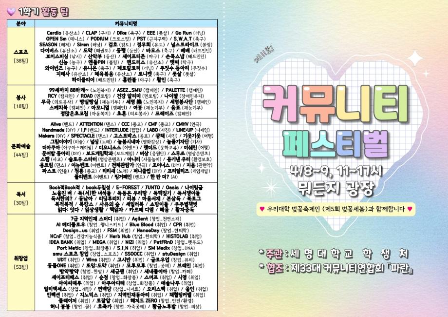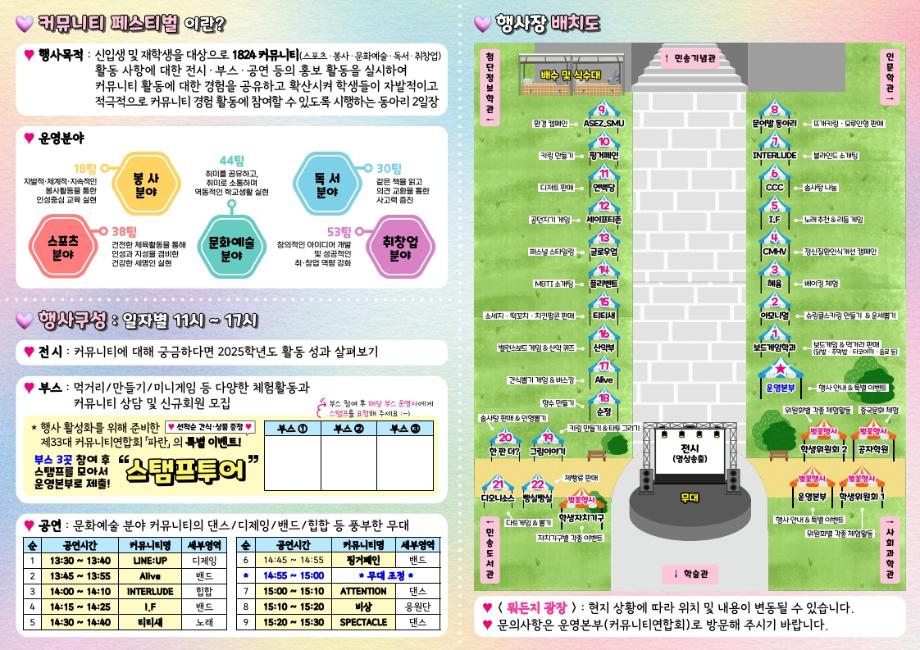 본문 시작 홈으로 SMIT 소식 SMIT 소개 SMIT 교육 SMIT 취업 SMIT 소식 SMIT 입학 홈페이지가이드 갤러리 공지사항 갤러리 경진대회 동아리 갤러리 페이스북 트위터 프린트 🎪 <제11회 커뮤니티 페스티벌> 시행 안내 🎪 스마트IT학부 23 2026-04-06 🎪 <제11회 커뮤니티 페스티벌> 시행 안내 🎪 목록 이전AI융합대학으로 명칭 변경! 다음 제 5회 세명대학교 벚꽃축제 '벚꽃세봄' 개최 안내 담당부서 : 스마트IT학부 담당자 : - 연락처 : 043-649-1275 최종수정일 : 2024-10-26 만족도조사 만족도 조사 이 페이지에서 제공하는 정보에 대하여 만족하시나요? 매우만족 만족 보통 불만족 매우불만족