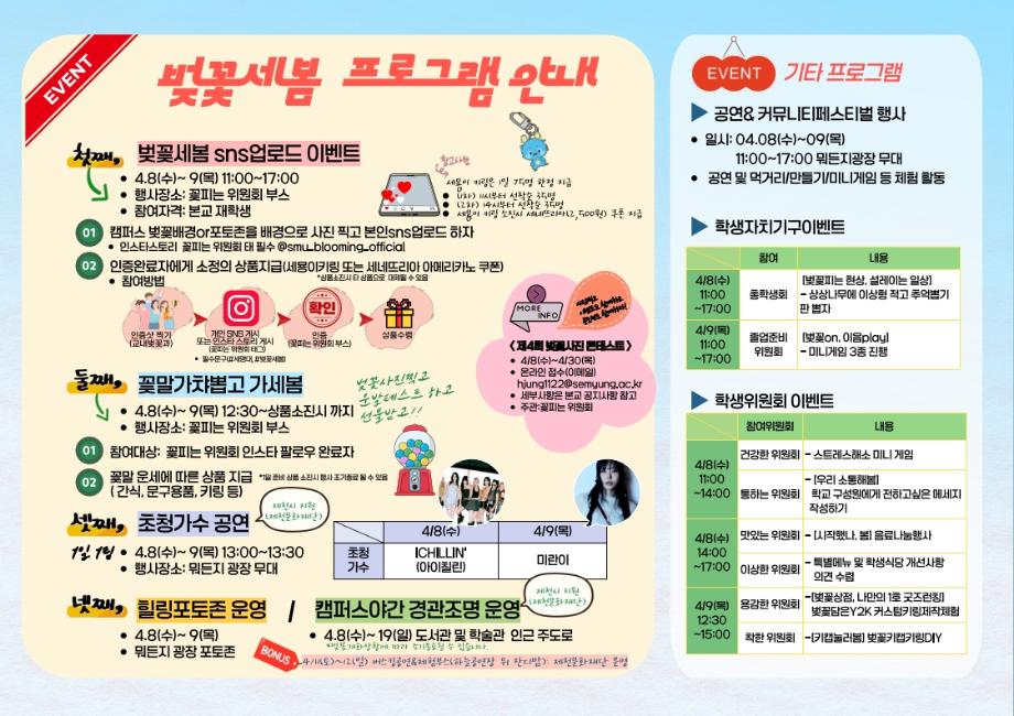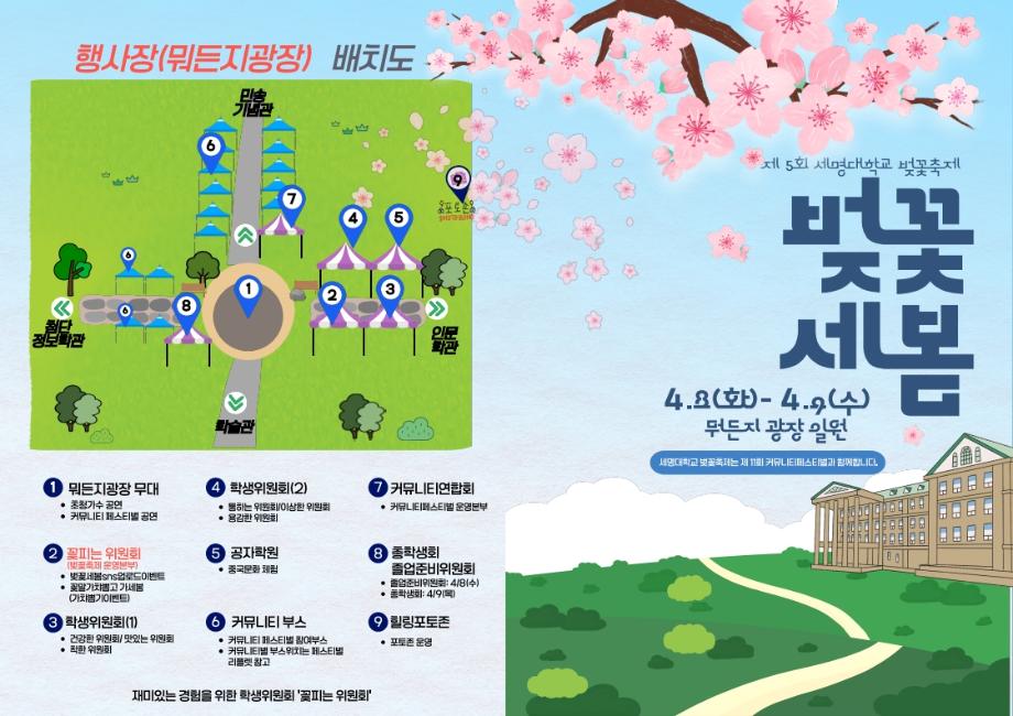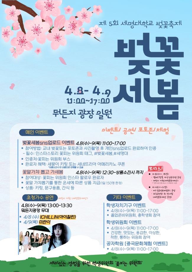 본문 시작 홈으로 SMIT 소식 SMIT 소개 SMIT 교육 SMIT 취업 SMIT 소식 SMIT 입학 홈페이지가이드 갤러리 공지사항 갤러리 경진대회 동아리 갤러리 페이스북 트위터 프린트 제 5회 세명대학교 벚꽃축제 '벚꽃세봄' 개최 안내 스마트IT학부 25 2026-04-06 제 5회 세명대학교 벚꽃축제 '벚꽃세봄' 개최 안내 목록 이전🎪 <제11회 커뮤니티 페스티벌> 시행 안내 🎪 담당부서 : 스마트IT학부 담당자 : - 연락처 : 043-649-1275 최종수정일 : 2024-10-26 만족도조사 만족도 조사 이 페이지에서 제공하는 정보에 대하여 만족하시나요? 매우만족 만족 보통 불만족 매우불만족