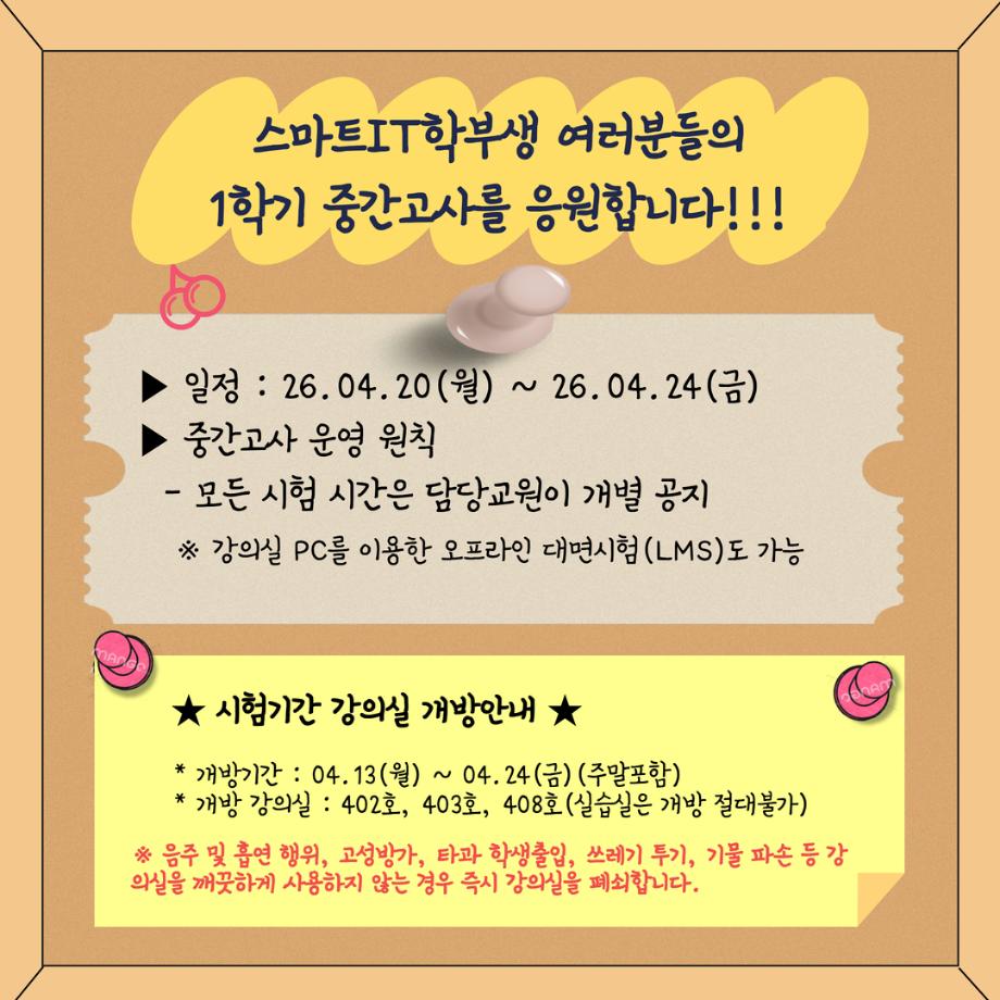 본문 시작 홈으로 SMIT 소식 SMIT 소개 SMIT 교육 SMIT 취업 SMIT 소식 SMIT 입학 홈페이지가이드 갤러리 공지사항 갤러리 경진대회 동아리 갤러리 페이스북 트위터 프린트 세명대알림_4월(1) : 2026학년도 1학기 중간고사 스마트IT학부 82 2026-04-14 세명대알림_4월(1) : 2026학년도 1학기 중간고사 목록 이전제 5회 세명대학교 벚꽃축제 '벚꽃세봄' 개최 안내 다음 세명대알림_4월(2) : 세명대학교 벚꽃 담당부서 : 스마트IT학부 담당자 : - 연락처 : 043-649-1275 최종수정일 : 2024-10-26 만족도조사 만족도 조사 이 페이지에서 제공하는 정보에 대하여 만족하시나요? 매우만족 만족 보통 불만족 매우불만족