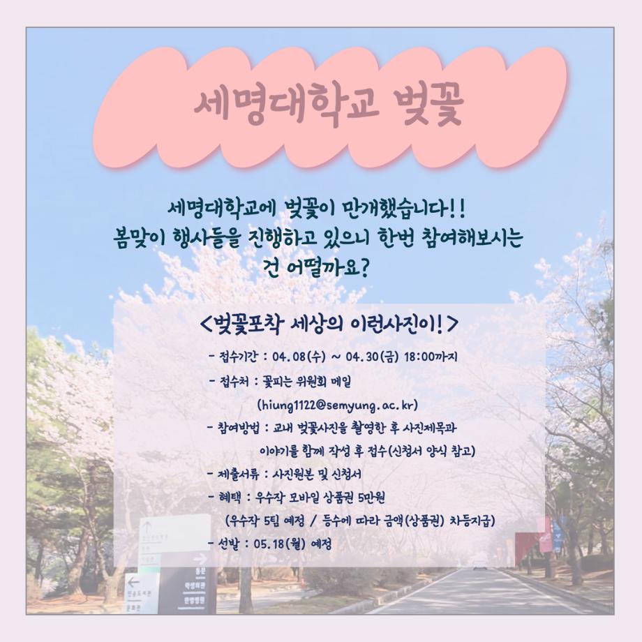 본문 시작 홈으로 SMIT 소식 SMIT 소개 SMIT 교육 SMIT 취업 SMIT 소식 SMIT 입학 홈페이지가이드 갤러리 공지사항 갤러리 경진대회 동아리 갤러리 페이스북 트위터 프린트 세명대알림_4월(2) : 세명대학교 벚꽃 스마트IT학부 83 2026-04-14 세명대알림_4월(2) : 세명대학교 벚꽃 목록 이전세명대알림_4월(1) : 2026학년도 1학기 중간고사 다음 스마트IT알림_4월 : 스마트IT학부 졸업요건 담당부서 : 스마트IT학부 담당자 : - 연락처 : 043-649-1275 최종수정일 : 2024-10-26 만족도조사 만족도 조사 이 페이지에서 제공하는 정보에 대하여 만족하시나요? 매우만족 만족 보통 불만족 매우불만족