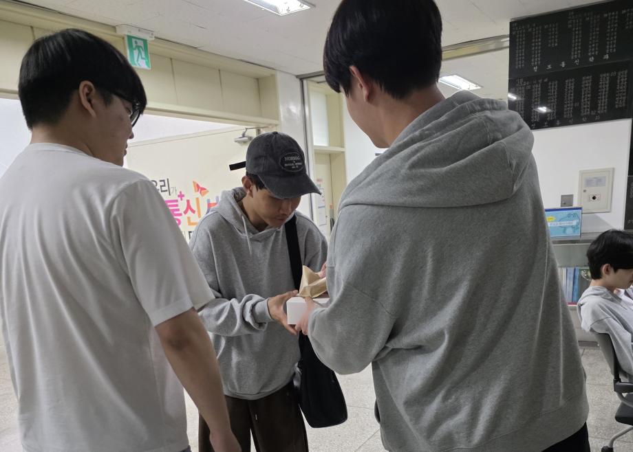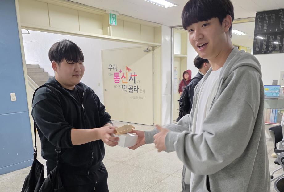본문 시작 홈으로 SMIT 소식 SMIT 소개 SMIT 교육 SMIT 취업 SMIT 소식 SMIT 입학 홈페이지가이드 갤러리 공지사항 갤러리 경진대회 동아리 갤러리 페이스북 트위터 프린트 2026학년도 스마트IT학부 중간고사 간식나눔 이벤트👊 스마트IT학부 48 2026-04-20 안녕하세요 세명대학교 스마트IT학부입니다😀 2026년 4월 20일 신입생들을 위해 중간고사 응원 간식 나눔 행사를 진행하였습니다. 작은 선물이지만 열심히 준비한 만큼 맛있게 드셔주셔서 감사드리며, 머지않은 중간고사, 학우분들 화이팅하시고 노력한만큼 좋은 결과로 보답받으시길 응원합니다👊 목록 이전스마트IT알림_4월 : 스마트IT학부 졸업요건 담당부서 : 스마트IT학부 담당자 : - 연락처 : 043-649-1275 최종수정일 : 2024-10-26 만족도조사 만족도 조사 이 페이지에서 제공하는 정보에 대하여 만족하시나요? 매우만족 만족 보통 불만족 매우불만족