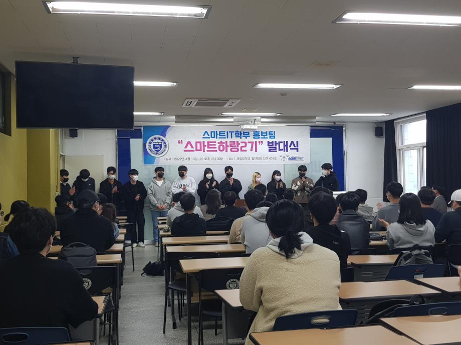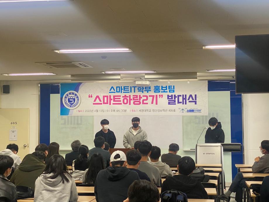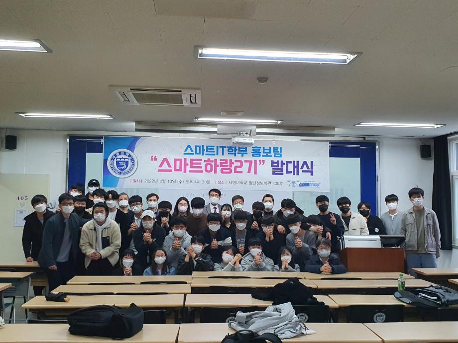 본문 시작 홈으로 SMIT 소식 SMIT 소개 SMIT 교육 SMIT 취업 SMIT 소식 SMIT 입학 홈페이지가이드 갤러리 공지사항 갤러리 경진대회 동아리 갤러리 페이스북 트위터 프린트 스마트IT학부 홍보팀 '스마트하랑2기' 발대식 스마트IT학부 2653 2022-04-13 4월13일(수) 오후 4시30분에 첨단정보학관과 벚꽃이 화사한 교정에서 1학년 43명과 학부교수님, 학회 임원들이 참가해서, 홍보팀 ‘2기 스마트하랑’ 발대식과 함께 2022년도 학부 홍보 활동을 본격적으로 시작하였다. 스마트하랑은 ‘스마트’와 [함께 높이 날다] 뜻인 ‘하랑’의 합성어로, 세명대 스마트IT 학부를 세상에 널리 알리기 위한 사명감으로, 작년부터 학부 SNS 중심으로 홍보활동을 진행하고 있다. 목록 이전제천고 자연과학 아카데미 1차 진행 다음 스마트IT학부 제천중학교 '가보자구' 과학축제 행사 참여 담당부서 : 스마트IT학부 담당자 : - 연락처 : 043-649-1275 최종수정일 : 2024-10-26 만족도조사 만족도 조사 이 페이지에서 제공하는 정보에 대하여 만족하시나요? 매우만족 만족 보통 불만족 매우불만족