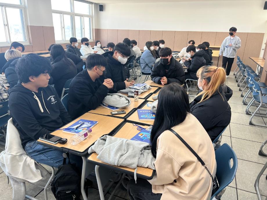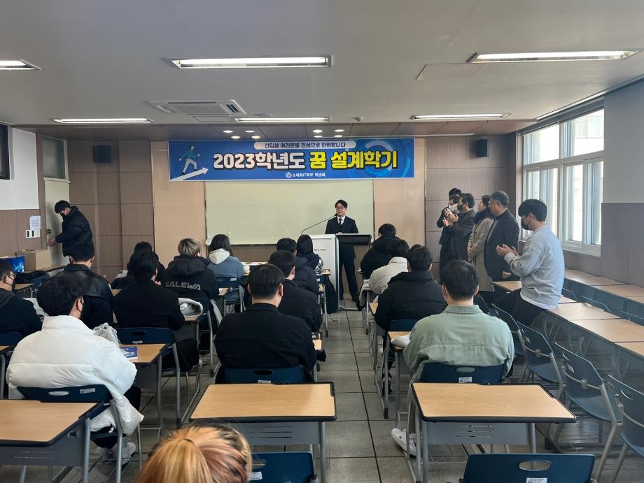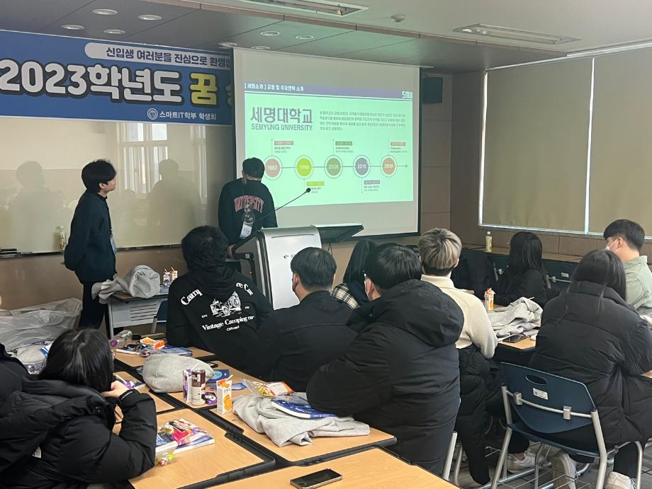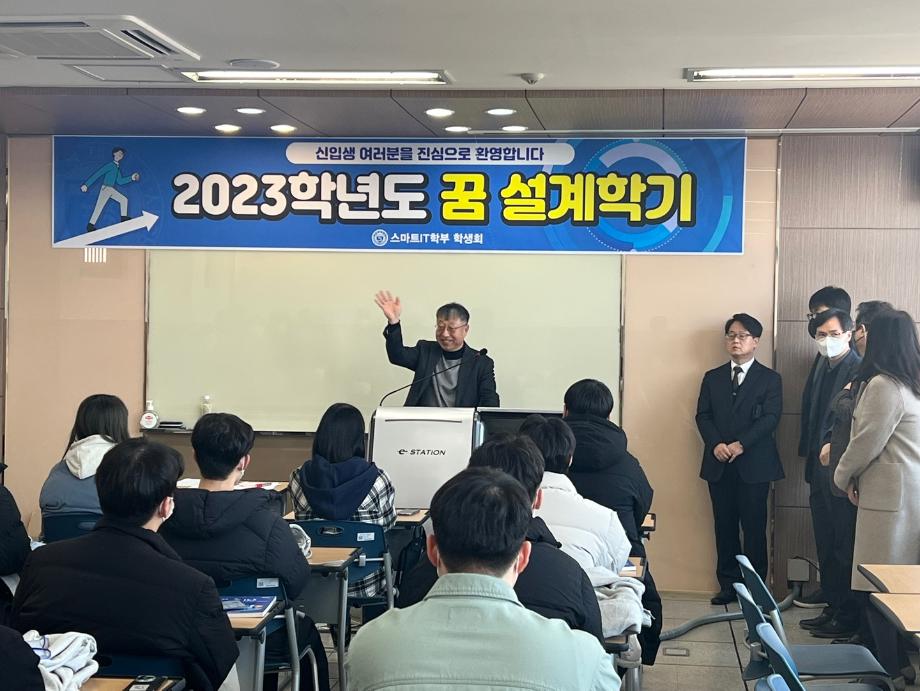 본문 시작 홈으로 SMIT 소식 SMIT 소개 SMIT 교육 SMIT 취업 SMIT 소식 SMIT 입학 홈페이지가이드 갤러리 공지사항 갤러리 경진대회 동아리 갤러리 페이스북 트위터 프린트 2023학년도 꿈 설계학기 1일차 스마트IT학부 7079 2023-02-20 스마트IT학부는 세명대학교 전체 신입생을 대상으로 하는 "꿈 설계학기"를 2023년 2월20일부터 22일까지 진행한다. 1일차는 첨단정보학관 321호에서 교수님 및 학회소개, 신입생들 자기소개, 졸업생 및 재학생 환영 영상 시청 등의 프로그램으로 이루어졌다. '꿈 설계학기'를 통해 신입생들의 학교에 대한 소속감이 고취될 수 있던 유익한 시간이었다. 목록 이전스마트IT학부 전기 학위수여식 다음 2023학년도 꿈 설계학기 2일차 담당부서 : 스마트IT학부 담당자 : - 연락처 : 043-649-1275 최종수정일 : 2024-10-26 만족도조사 만족도 조사 이 페이지에서 제공하는 정보에 대하여 만족하시나요? 매우만족 만족 보통 불만족 매우불만족