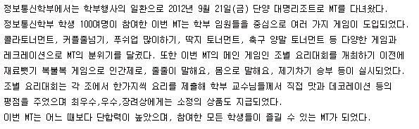 본문 시작 홈으로 SMIT 소식 SMIT 소개 SMIT 교육 SMIT 취업 SMIT 소식 SMIT 입학 홈페이지가이드 갤러리 공지사항 갤러리 경진대회 동아리 갤러리 페이스북 트위터 프린트 기업체험과 ACE 프로그램 일환 KT 견학 오선진 7383 2012-11-04 일시 : 2012년 10월 26일(금) 09:30 -18:00대상 : 정보통신학부 3,4학년 (70명)인솔 : 오선진 학부장, 이성재 교수출발장소 : 전산정보학관 앞 목록 이전2012년도 정보통신학부 연합 MT 다음 미드필더인증제 봉사활동 실시 담당부서 : 스마트IT학부 담당자 : - 연락처 : 043-649-1275 최종수정일 : 2024-10-26 만족도조사 만족도 조사 이 페이지에서 제공하는 정보에 대하여 만족하시나요? 매우만족 만족 보통 불만족 매우불만족