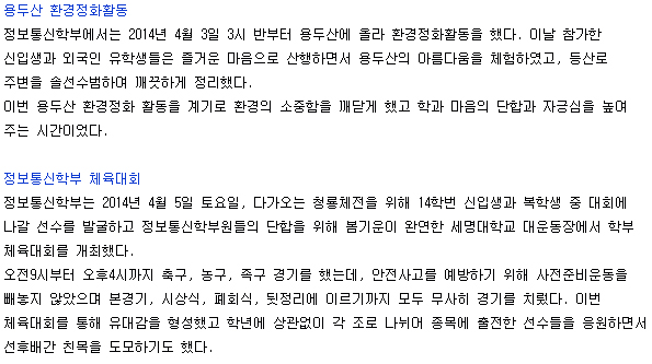 본문 시작 홈으로 SMIT 소식 SMIT 소개 SMIT 교육 SMIT 취업 SMIT 소식 SMIT 입학 홈페이지가이드 갤러리 공지사항 갤러리 경진대회 동아리 갤러리 페이스북 트위터 프린트 정보통신학부, 2014학년도 졸업작품중간발표회 개최 오선진 7585 2014-06-20 정보통신학부, 2014학년도 졸업작품중간발표회 개최 목록 이전정보통신학부, 용두산정화활동 및 체육대회실시 다음 정보통신학부, 글로벌 MT 개최 담당부서 : 스마트IT학부 담당자 : - 연락처 : 043-649-1275 최종수정일 : 2024-10-26 만족도조사 만족도 조사 이 페이지에서 제공하는 정보에 대하여 만족하시나요? 매우만족 만족 보통 불만족 매우불만족