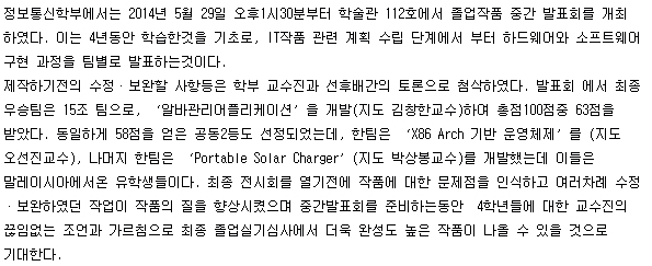 본문 시작 홈으로 SMIT 소식 SMIT 소개 SMIT 교육 SMIT 취업 SMIT 소식 SMIT 입학 홈페이지가이드 갤러리 공지사항 갤러리 경진대회 동아리 갤러리 페이스북 트위터 프린트 정보통신학부, 글로벌 MT 개최 오선진 7480 2014-10-02 2014년 9월 19일 - 20일춪주 켄싱톤 리조트 목록 이전정보통신학부, 2014학년도 졸업작품중간발표회 개최 다음 정보통신학부 졸업작품 전시회 및 학부 특성화 사업 설명회 개최 담당부서 : 스마트IT학부 담당자 : - 연락처 : 043-649-1275 최종수정일 : 2024-10-26 만족도조사 만족도 조사 이 페이지에서 제공하는 정보에 대하여 만족하시나요? 매우만족 만족 보통 불만족 매우불만족