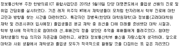 본문 시작 홈으로 SMIT 소식 SMIT 소개 SMIT 교육 SMIT 취업 SMIT 소식 SMIT 입학 홈페이지가이드 갤러리 공지사항 갤러리 경진대회 동아리 갤러리 페이스북 트위터 프린트 정보통신학부, "글로벌 정통 MT" 개최 관리자 6382 2015-09-30 정보통신학부, "글로벌 정통 MT" 개최 목록 이전한방-의료ICT 융합사업단, 졸업생 진로 및 취업간담회 실시 다음 한방-의료ICT 융합사업단, 캡스톤 디자인 경진대회 실시 담당부서 : 스마트IT학부 담당자 : - 연락처 : 043-649-1275 최종수정일 : 2024-10-26 만족도조사 만족도 조사 이 페이지에서 제공하는 정보에 대하여 만족하시나요? 매우만족 만족 보통 불만족 매우불만족