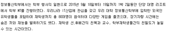 본문 시작 홈으로 SMIT 소식 SMIT 소개 SMIT 교육 SMIT 취업 SMIT 소식 SMIT 입학 홈페이지가이드 갤러리 공지사항 갤러리 경진대회 동아리 갤러리 페이스북 트위터 프린트 한방-의료ICT 융합사업단, 캡스톤 디자인 경진대회 실시 관리자 6297 2015-09-30 한방-의료ICT 융합사업단, 캡스톤 디자인 경진대회 실시 목록 이전정보통신학부, "글로벌 정통 MT" 개최 다음 한방-의료ICT 융합사업단, 융합전공 동아리 오리엔테이션 진행 담당부서 : 스마트IT학부 담당자 : - 연락처 : 043-649-1275 최종수정일 : 2024-10-26 만족도조사 만족도 조사 이 페이지에서 제공하는 정보에 대하여 만족하시나요? 매우만족 만족 보통 불만족 매우불만족