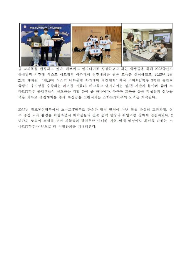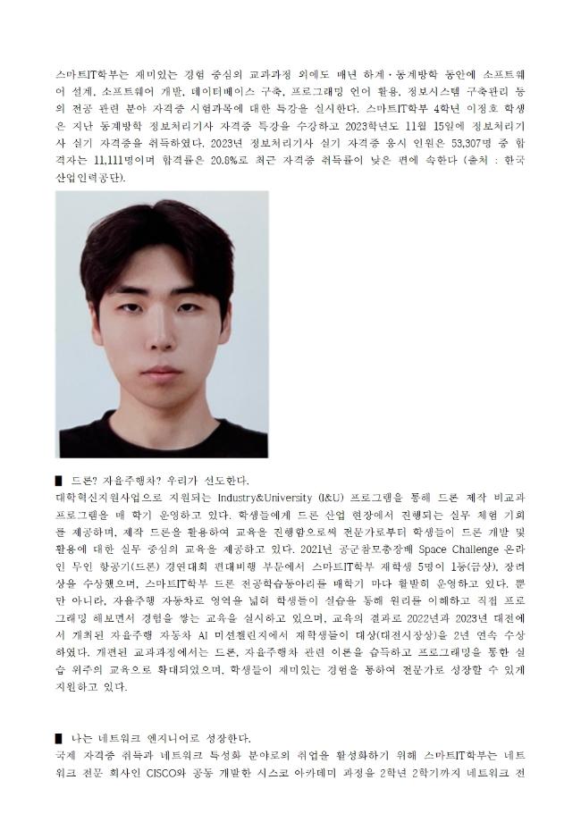 본문 시작 홈으로 SMIT 소식 SMIT 소개 SMIT 교육 SMIT 취업 SMIT 소식 SMIT 입학 홈페이지가이드 갤러리 공지사항 갤러리 경진대회 동아리 갤러리 페이스북 트위터 프린트 실무경험 ? 자격증? 취업 All in 세명대학교 스마트IT학부 스마트IT학부 2895 2024-01-04 안녕하세요. 세명대학교 스마트IT학부입니다. 스마트IT학부 보도자료 내용입니다. 실무경험? 자격증? 취업? All in 세명대학교 스마트IT학부! -실무능력을 중심으로 교과과정 개편 -자격증? 어려워도 우리는 자신있다 ! -드론? 자율주행차? 우리가 선도한다 -나는 네트워크 엔지니어로 성장한다. 목록 이전세명대학교 스마트IT학부는 이런 활동을 한다 ❗ 다음 동계방학 특별활동 “정보처리기사 자격증 특강” 실시!📚 담당부서 : 스마트IT학부 담당자 : - 연락처 : 043-649-1275 최종수정일 : 2024-10-26 만족도조사 만족도 조사 이 페이지에서 제공하는 정보에 대하여 만족하시나요? 매우만족 만족 보통 불만족 매우불만족