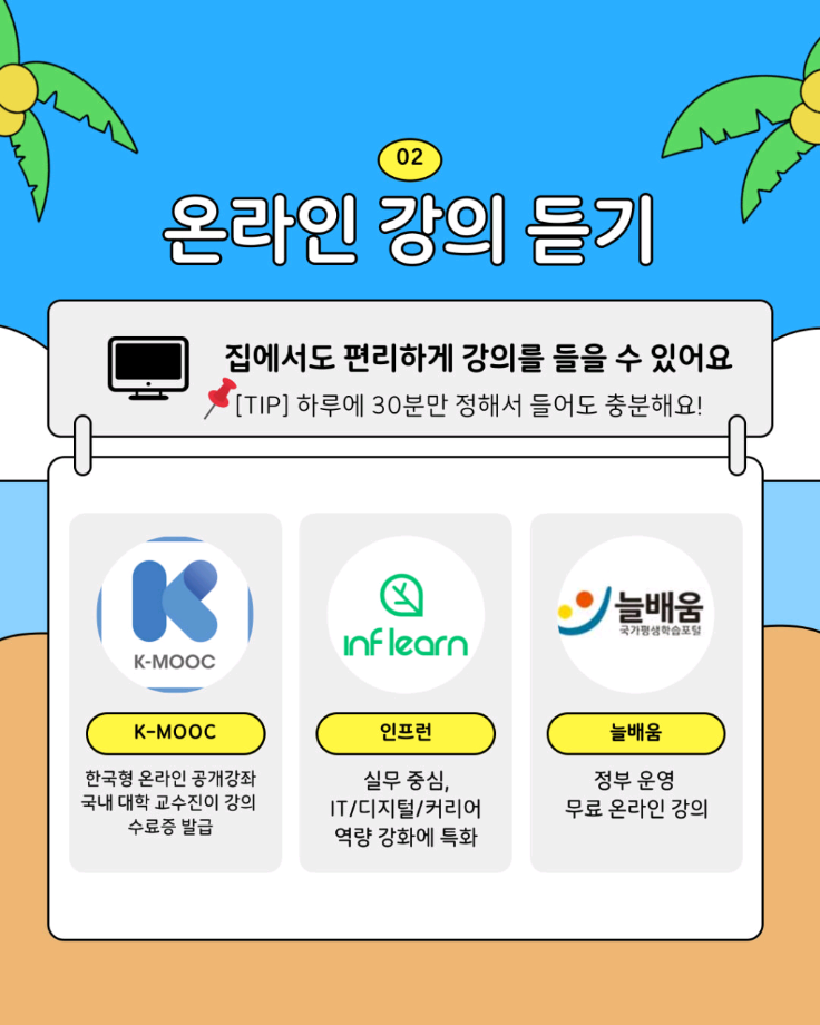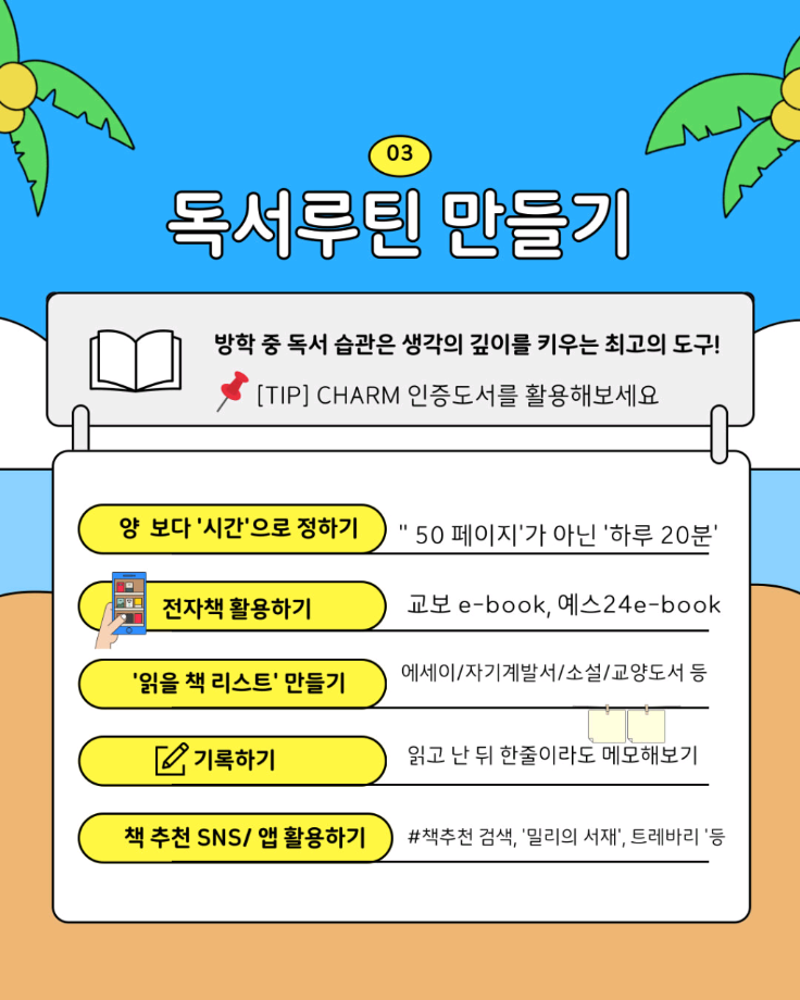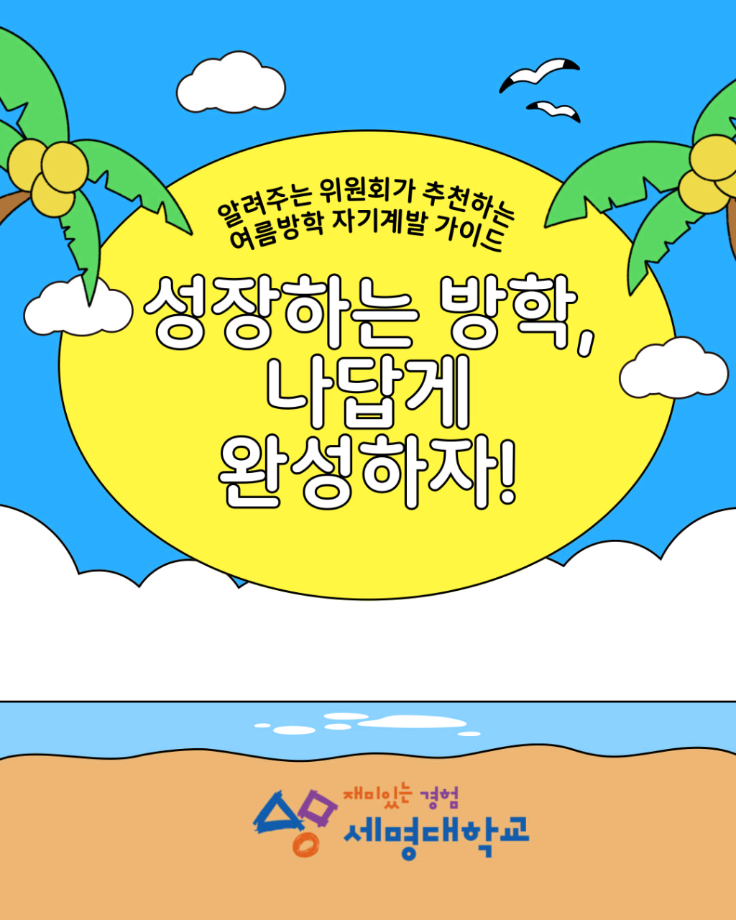 본문 시작 홈으로 SMIT 소식 SMIT 소개 SMIT 교육 SMIT 취업 SMIT 소식 SMIT 입학 홈페이지가이드 갤러리 공지사항 갤러리 경진대회 동아리 갤러리 페이스북 트위터 프린트 🌞여름방학 자기계발 가이드🏖️ 스마트IT학부 1575 2025-07-11 알려주는 위원회가 추천하는 🌞여름방학 자기계발 가이드🏖️ 📢 이번 방학, 그냥 흘려보낼 순 없죠! 자격증, 봉사, 독서까지 🌿 나만의 방식으로 성장하는 여름방학 시작해봐요! 알려주는 위원회가 추천하는 자기계발 꿀팁, 카드뉴스로 확인해보세요! ☀️ 출처 : 세명대학교 인스타그램 #세명대 #세명대학교 #대학 #방학자기계발 #성장하는방학 #자격증준비 #무료강의 #독서루틴 #봉사활동 #여름방학 #여름 목록 이전스마트IT학부 기말고사 간식나눔 이벤트👊 다음 CHARM인증제를 알려줘!⭐️ 담당부서 : 스마트IT학부 담당자 : - 연락처 : 043-649-1275 최종수정일 : 2024-10-26 만족도조사 만족도 조사 이 페이지에서 제공하는 정보에 대하여 만족하시나요? 매우만족 만족 보통 불만족 매우불만족