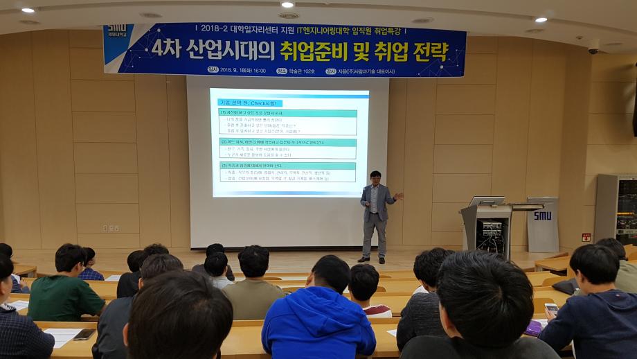 정보통신학부에서는 2018학년도 IT엔지니어링대학 임직원 취업특강으로 09월 18일(화) (주)사람과 기술 대표이사를 모시고 4차 산업시대의 취업준비 및 취업전략에 관한 특강을 진행하였다. 특강은 학술관 102호에서 진행되었으며 사회 환경의 변화와 청년실업의 문제점 분석, 직업 및 회사 선택의 기준제시, 기업이 원하는 인재상 분석 등의 내용으로 진행되었다. 이 특강을 통해 재학생들은 취업준비에 필요한 견문을 넓힐 수 있었고 전문지식 및 현장실무능력의 중요성을 깨달을 수 있게 되었다.