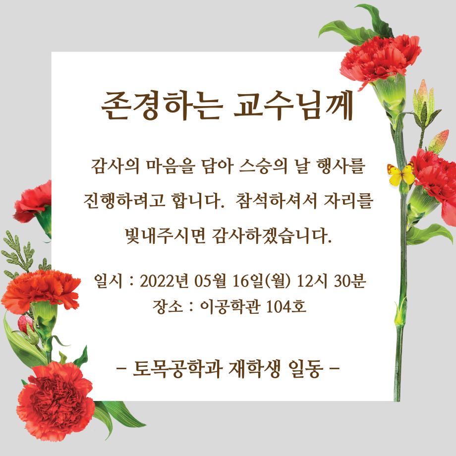 본문 시작 홈으로 커뮤니티 학과소개 교수소개 학과과정 커뮤니티 학과게시판 홈페이지가이드 포토갤러리 포토갤러리 전공자료실 학생회 동아리 포토갤러리 페이스북 트위터 프린트 2022학년도 스승의 날 토목공학과 3837 2022-05-18 지난 5월 16일, 토목공학과 학생회 및 재학생들은 학과 교수님들을 위해 스승의 날 행사를 진행하였습니다. 재학생들은 교수님들의 교육과 지도에 감사하는 마음을 담아 직접 손편지를 작성하여 각 교수님께 전달해드리고 꽃다발과 선물을 준비하여 감사를 표했습니다. 이어 학과장 교수님의 답례인사로 행사는 마무리 되었습니다. 이번 스승의 날 행사 진행으로 재학생들과 교수님들의 사제지간을 더욱 돈독히 하는 시간이 되었습니다. 목록 이전2022학년도 신입생 성년의 날 다음 2022학년도 자격증특강 담당부서 : 건설환경공학과 담당자 : - 연락처 : 043-649-1778 최종수정일 : 2024-10-26 만족도조사 만족도 조사 이 페이지에서 제공하는 정보에 대하여 만족하시나요? 매우만족 만족 보통 불만족 매우불만족