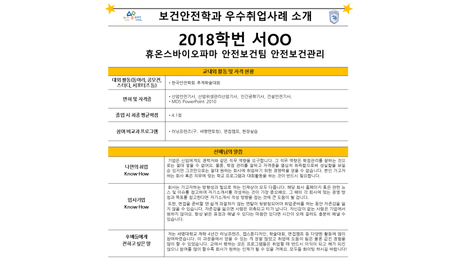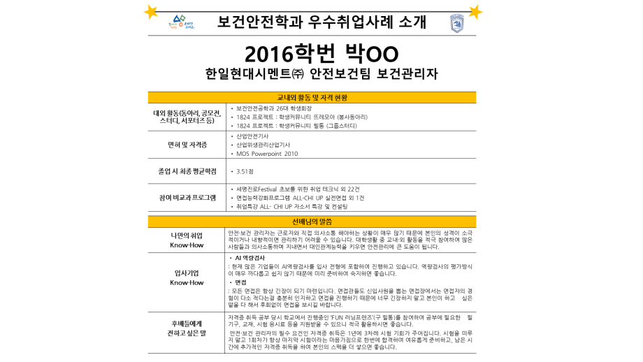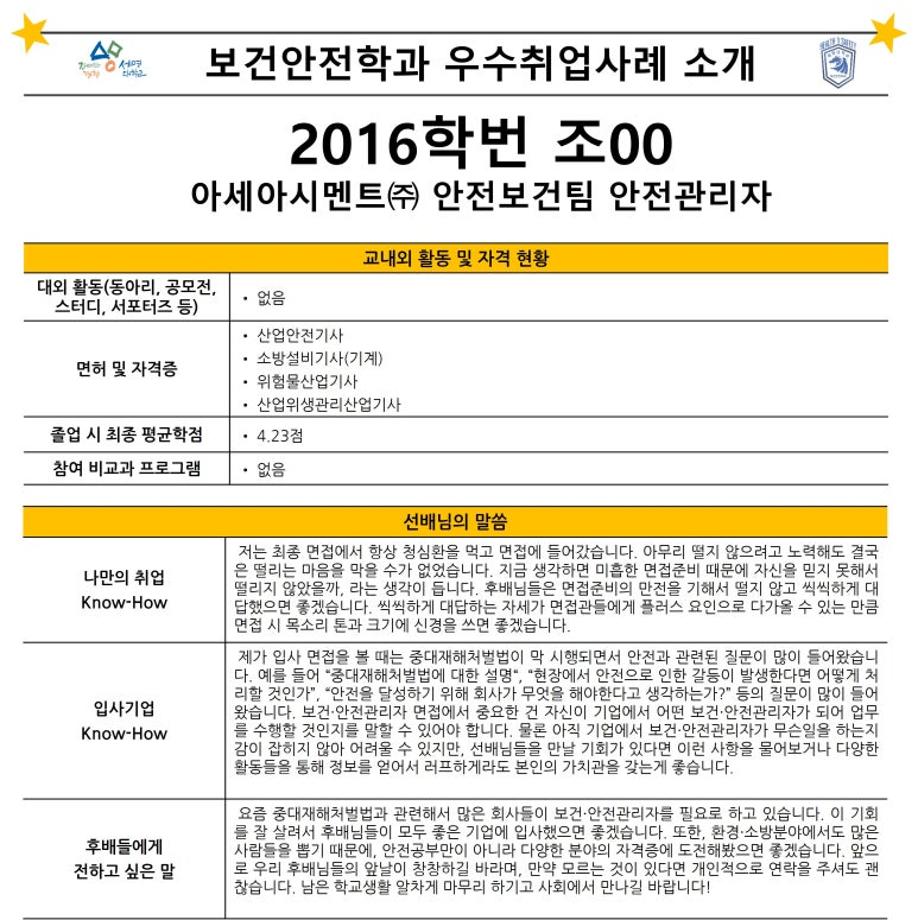 본문 시작 홈으로 커뮤니티 학과소개 진로 및 취업 교수소개 학과과정 커뮤니티 홈페이지가이드 포토갤러리 학과공지 학사일정 포토갤러리 학생회 학과영상 보건안전학과 인스타 보건안전학과 블로그 포토갤러리 페이스북 트위터 프린트 보건안전학과 우수취업사례 보건안전학과 2697 2024-09-09 보건안전학과 우수취업사례 목록 이전제6회 현장실습 우수사례 수기 공모전 학과 학생 수상 다음 한국설비안전학회 우수논문상 담당부서 : 보건안전학과 담당자 : - 연락처 : 043-649-1777 최종수정일 : 2024-10-26 만족도조사 만족도 조사 이 페이지에서 제공하는 정보에 대하여 만족하시나요? 매우만족 만족 보통 불만족 매우불만족
