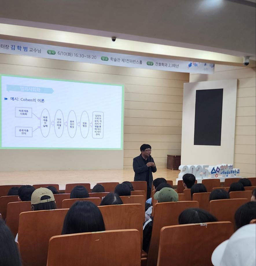 내용: 간호학과는 지난 2025년 6월 10일(화), 재학생들을 대상으로 인권센터장(경찰학과 교수) 김학범 교수님을 초청하여 인권교육 특강을 진행하였습니다. 교수님은 대학생으로서, 향후 간호사로서 의료현장에서 일을 할 때 주의해야 할 사례를 중심으로 실제 법적 기준을 적용한 다양한 내용을 쉽게 설명해 주셨습니다.