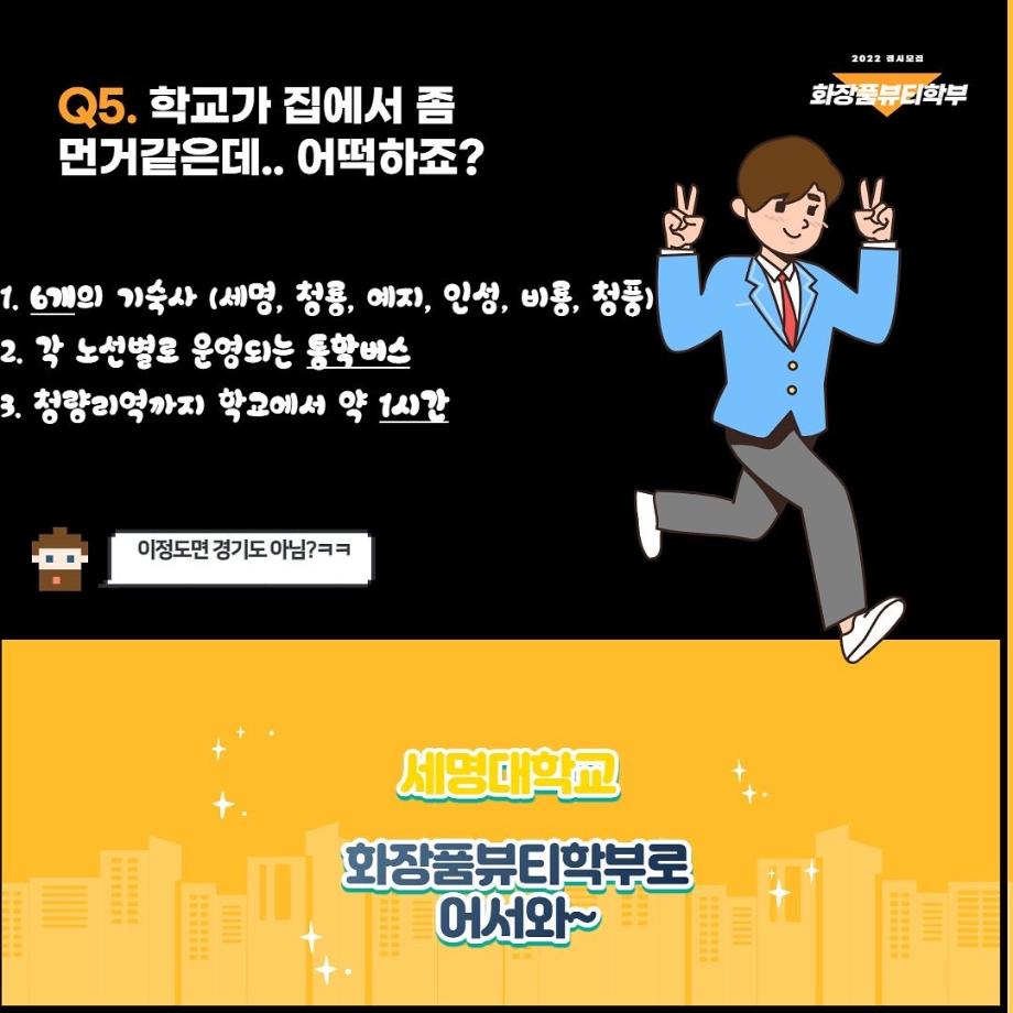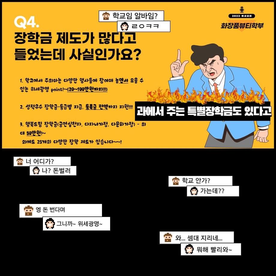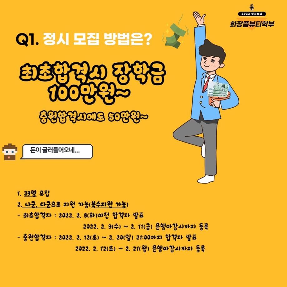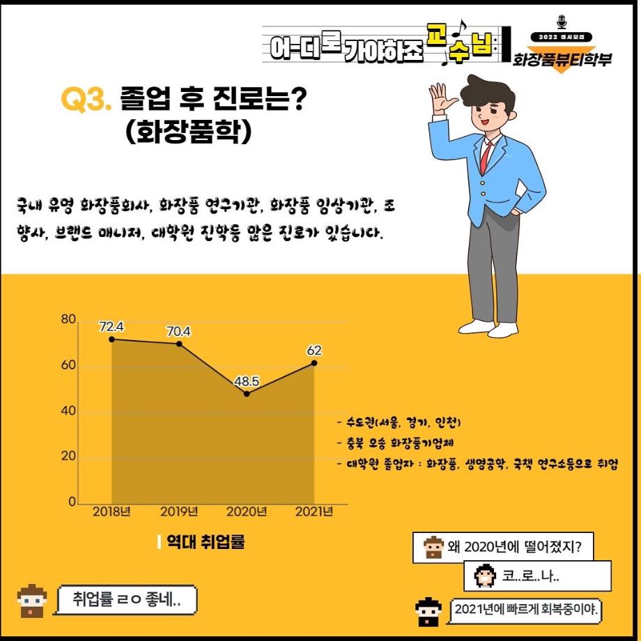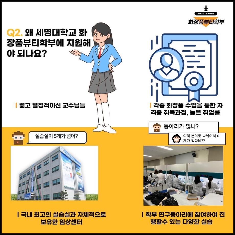 본문 시작 홈으로 커뮤니티 학과소개 학과과정 대학원 커뮤니티 연구동아리 홈페이지가이드 포토갤러리 학과공지 채용정보 학과일정 포토갤러리 유튜브 인스타그램 취업현황 학생회 조직도 졸업생 숏터뷰 포토갤러리 페이스북 트위터 프린트 세명대학교 화장품뷰티학부 2022학년도 정시모집 안내 화장품뷰티학부 3280 2022-01-13 그곳이 알고싶다! 세명대학교 화장품뷰티학부를 소개합니다~ 목록 이전2021학년도 캡스톤디자인 경진대회 입상_단오 팀 다음 2021학년도 화장품뷰티학부 공유대학 혁신인재장학금 장학생 명단 담당부서 : 바이오코스메틱학과 담당자 : - 연락처 : 043-649-1638 최종수정일 : 2024-10-26 만족도조사 만족도 조사 이 페이지에서 제공하는 정보에 대하여 만족하시나요? 매우만족 만족 보통 불만족 매우불만족