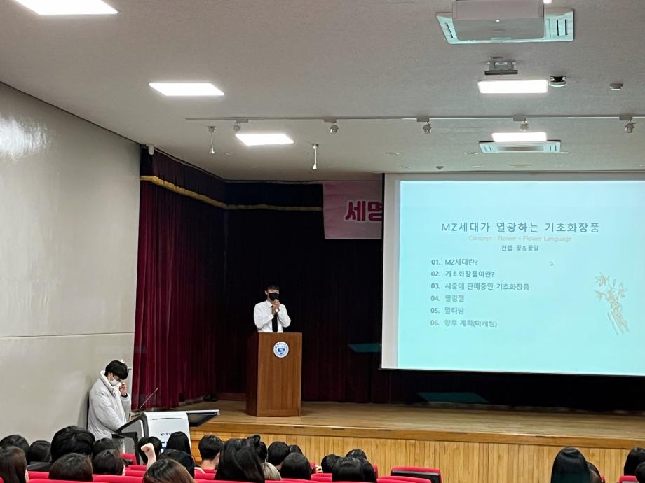 조색+충전형 립스틱 소개, MZ세대가 열광할 기초화장품 및 색조화장품 소개 등 다양한 주제를 바탕으로 학생들이 각자 제품을 기획하고 마케팅까지 해보며 발표하는 시간을 가졌답니다 :)