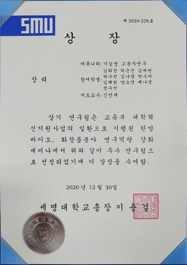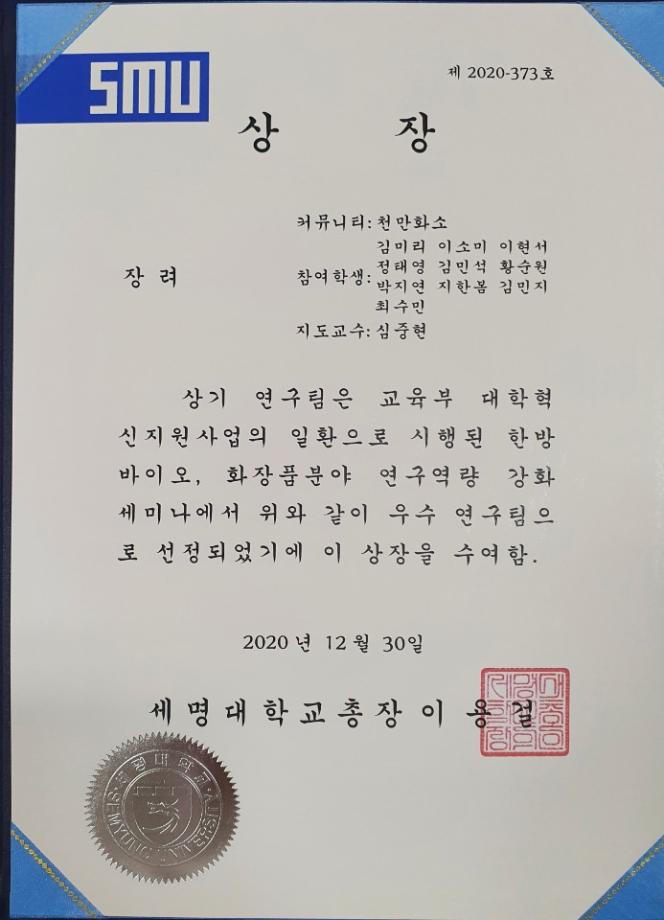 우리 화장품뷰티생명공학부에서는 총 5개의 커뮤니티가 참여하여 연간 연구수행내용, 포스터 발표, 논문게재 내용 등 연구 성과물을 공개하였습니다. COVID-19로 연구 활동에 많은 어려움이 있었지만, 우수한 성과로 상장(최우수 1팀, 우수 2팀, 장려 3팀)을 수여 받았습니다.