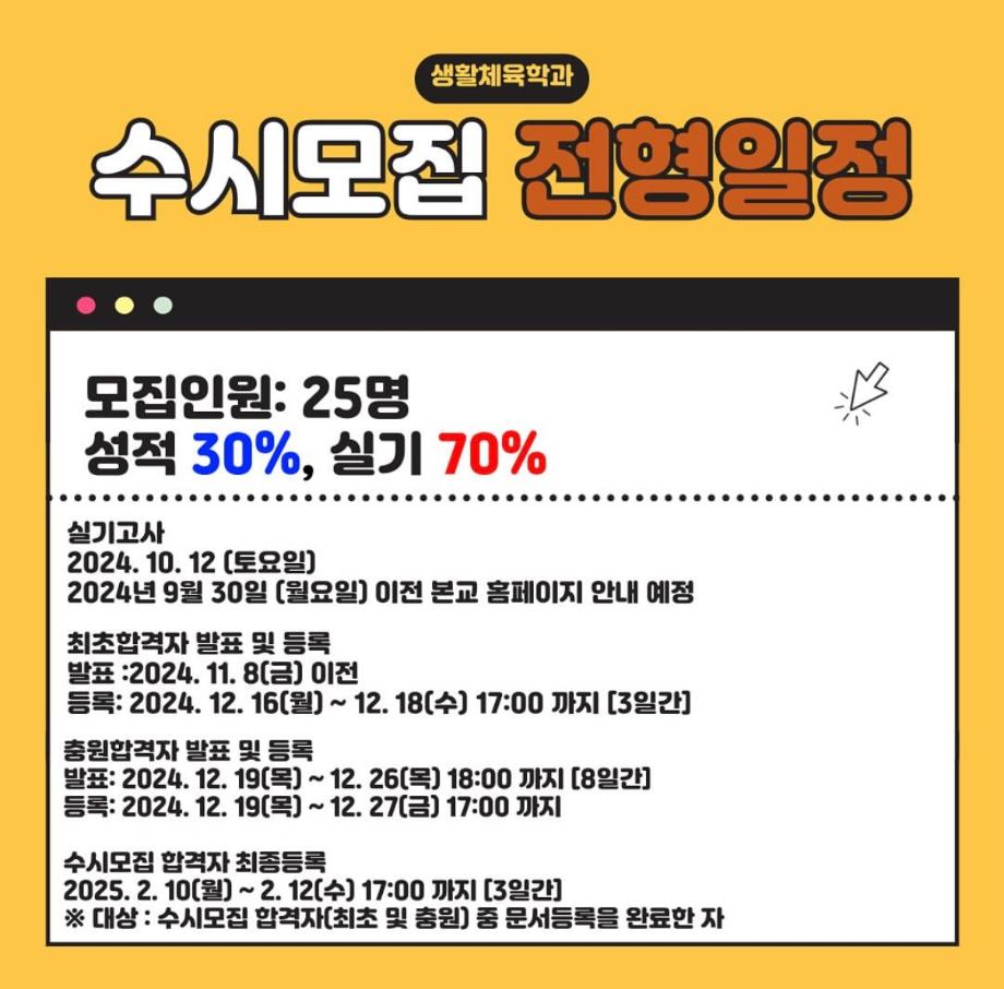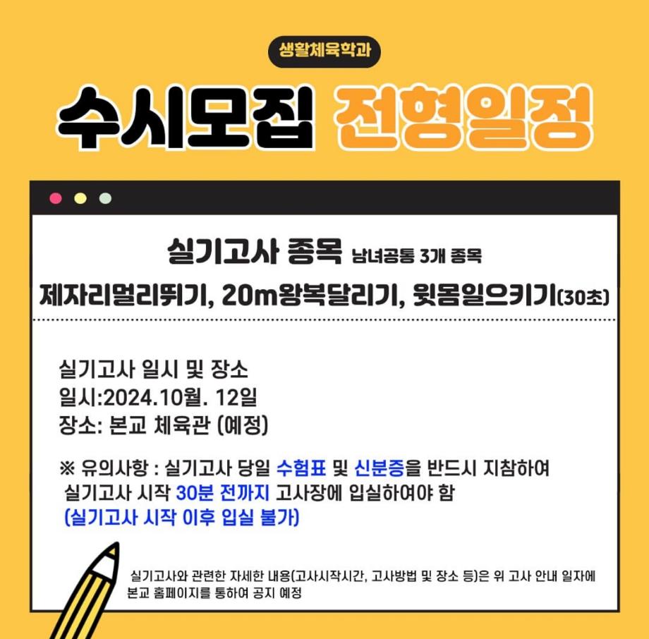 본문 시작 홈으로 커뮤니티SNS 학과소개 진로취업사례 입학안내 교육과정 커뮤니티SNS 홈페이지가이드 학과행사갤러리 학과공지 열린정보SNS 학과동아리 학과행사갤러리 학과MOU 학생회조직도 학과연혁 동문회조직도 학과행사갤러리 페이스북 트위터 프린트 생활체육학과 2025학년도 수시모집 실기고사 생활체육학과 2515 2024-10-07 생활체육학과 2025학년도 수시모집 실기고사 목록 이전2024학년도 1학년 축구 수업 팀별 단체사진 다음 2024학년도 총장배 대비 축구, 피구 연습 담당부서 : 생활체육학과 담당자 : - 연락처 : 043-469-1289 최종수정일 : 2024-10-26 만족도조사 만족도 조사 이 페이지에서 제공하는 정보에 대하여 만족하시나요? 매우만족 만족 보통 불만족 매우불만족