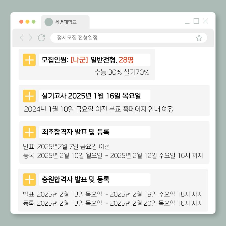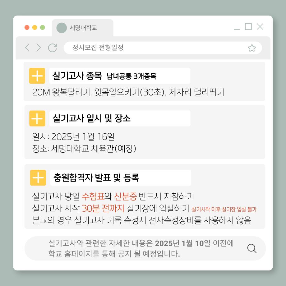 본문 시작 홈으로 커뮤니티SNS 학과소개 진로취업사례 입학안내 교육과정 커뮤니티SNS 홈페이지가이드 학과행사갤러리 학과공지 열린정보SNS 학과동아리 학과행사갤러리 학과MOU 학생회조직도 학과연혁 동문회조직도 학과행사갤러리 페이스북 트위터 프린트 2025학년도 정시 실기고사 생활체육학과 3249 2025-01-09 2025학년도 세명대학교 생활체육학과 정시모집 전형일정 및 실기고사 안내입니다 ! 목록 이전2024학년도 동계스포츠 다음 2025학년도 정시 실기고사 시행 담당부서 : 생활체육학과 담당자 : - 연락처 : 043-469-1289 최종수정일 : 2024-10-26 만족도조사 만족도 조사 이 페이지에서 제공하는 정보에 대하여 만족하시나요? 매우만족 만족 보통 불만족 매우불만족