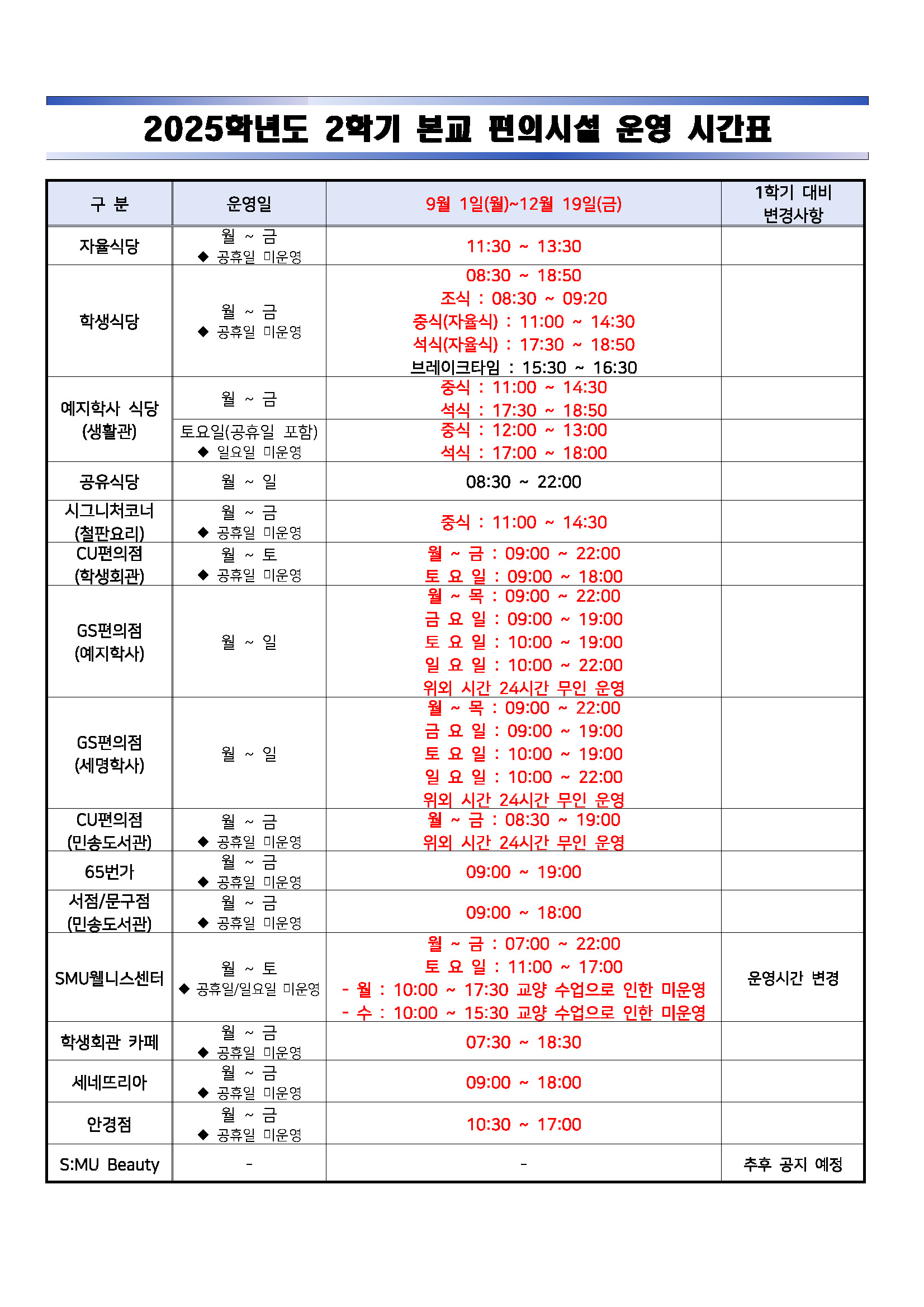 본문 시작 홈으로 커뮤니티 대학소개 학과소개 입학안내 커뮤니티 홈페이지가이드 대학소식 대학소식 학과소식 자료실 대학소식 페이스북 트위터 프린트 2025학년도 2학기 본교 편의시설 운영 안내식당, 편의점, 카페, 웰니스센터 헬스장, 안경점, 서점, 미용실 보건바이오대학 조회 : 536 등록일 : 2025-08-28 (공지) 2025학년도 2학기 편의시설 운영표_20250826.pdf ( 63 kb) ?atchFileId=FILE_000000000228754&fileSn=0 (공지) 2025학년도 2학기 편의시설 운영표_20250826.pdf ◎ 2025학년도 2학기 본교 편의시설이 아래와 같이 운영되오니, 이용에 참고하시기 바랍니다. 목록 이전2025년 보건바이오대학 '제3회 VIVA BOBA 한마음 운동회' 결과 다음 2025학년도 2학기 직통 시외버스 [본교 ↔ 동서울터미널] 운행사항 안내 경기·대원고속 만족도조사 만족도 조사 이 페이지에서 제공하는 정보에 대하여 만족하시나요? 매우만족 만족 보통 불만족 매우불만족