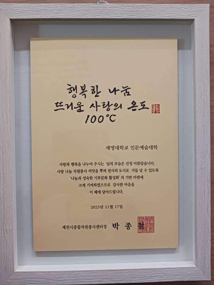 본문 시작 홈으로 커뮤니티 대학소개 학과소개 입학안내 커뮤니티 홈페이지가이드 사진 자료실 대학소식 학과소식 자료실 사진 자료실 동영상 자료실 사진 자료실 페이스북 트위터 프린트 인문예술대학 제천시자원봉사센터장 감사패 수상 인문예술대학 2806 2023-11-16 인문예술대학 제천시자원봉사센터장 감사패 수상 목록 이전모듈형 교육과정 위원회 3차 회의 다음 콘텐츠스쿨 2023 창작물 쇼케이스 및 2024 비전 발표회 성황리 종료 담당부서 : 인문예술대학 담당자 : - 연락처 : 043-649-7402 최종수정일 : 2024-10-26 만족도조사 만족도 조사 이 페이지에서 제공하는 정보에 대하여 만족하시나요? 매우만족 만족 보통 불만족 매우불만족