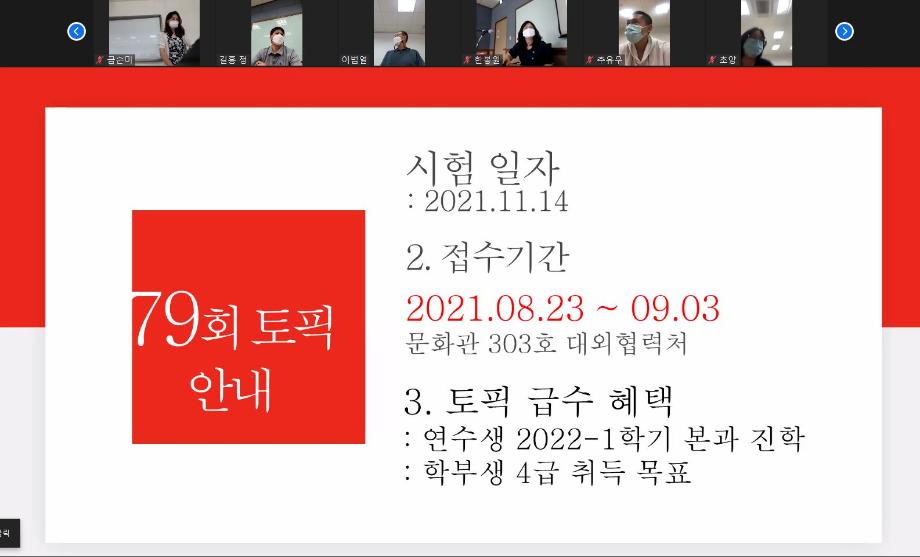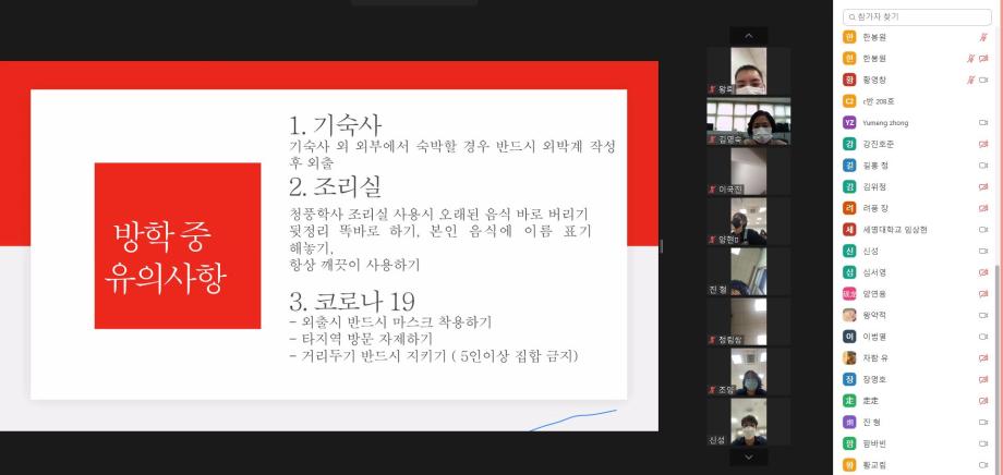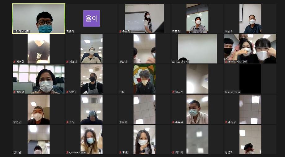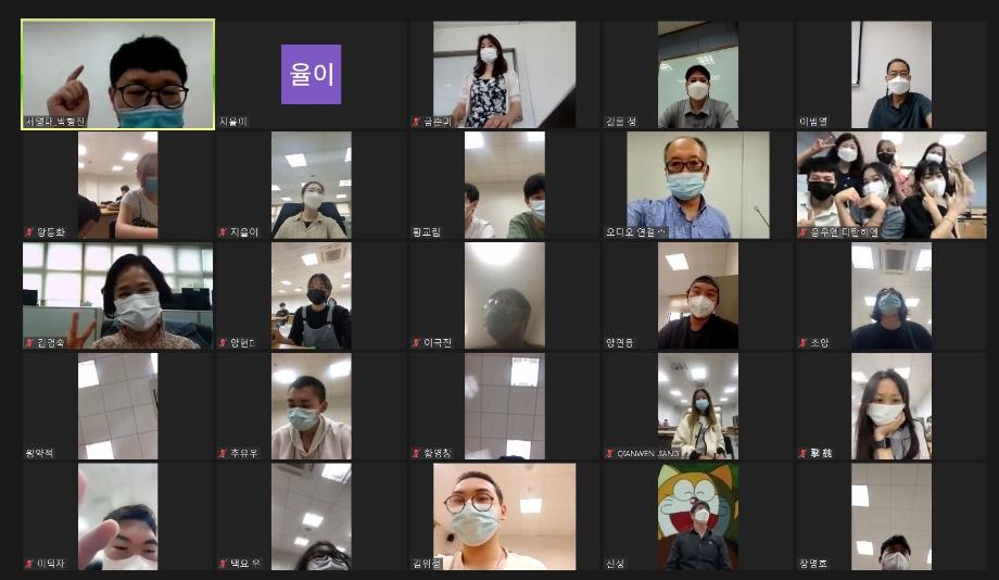 본문 시작 2021-여름 한국어연수생 종강식 국제교육원 2306 2021-08-13 2021-여름 한국어연수생 종강식 코로나19로 인해 비대면 종강식을 실시하였습니다. 목록 이전2021-여름 생활적응지원프로그램 다음 2021-가을학기 신입생 오리엔테이션 담당부서 : 국제교육원 담당자 : - 연락처 : 043-649-1185 최종수정일 : 2024-10-26 만족도조사 만족도 조사 이 페이지에서 제공하는 정보에 대하여 만족하시나요? 매우만족 만족 보통 불만족 매우불만족
