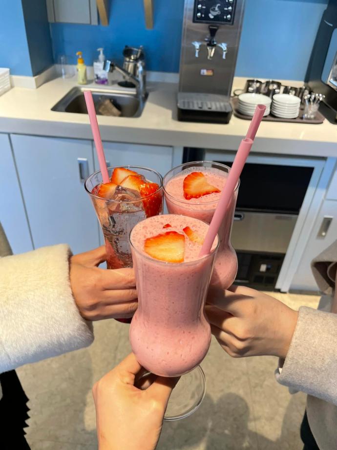 특히, 식음료 서비스 실습 시간에는 고등학생들이 직접 애프터눈티 세트와 딸기에이드, 딸기 요거트 스무디, 카페 라떼 등 다양한 음료를 만들어 대학생 멘토에게 서비스해 주어 감동을 주었습니다.