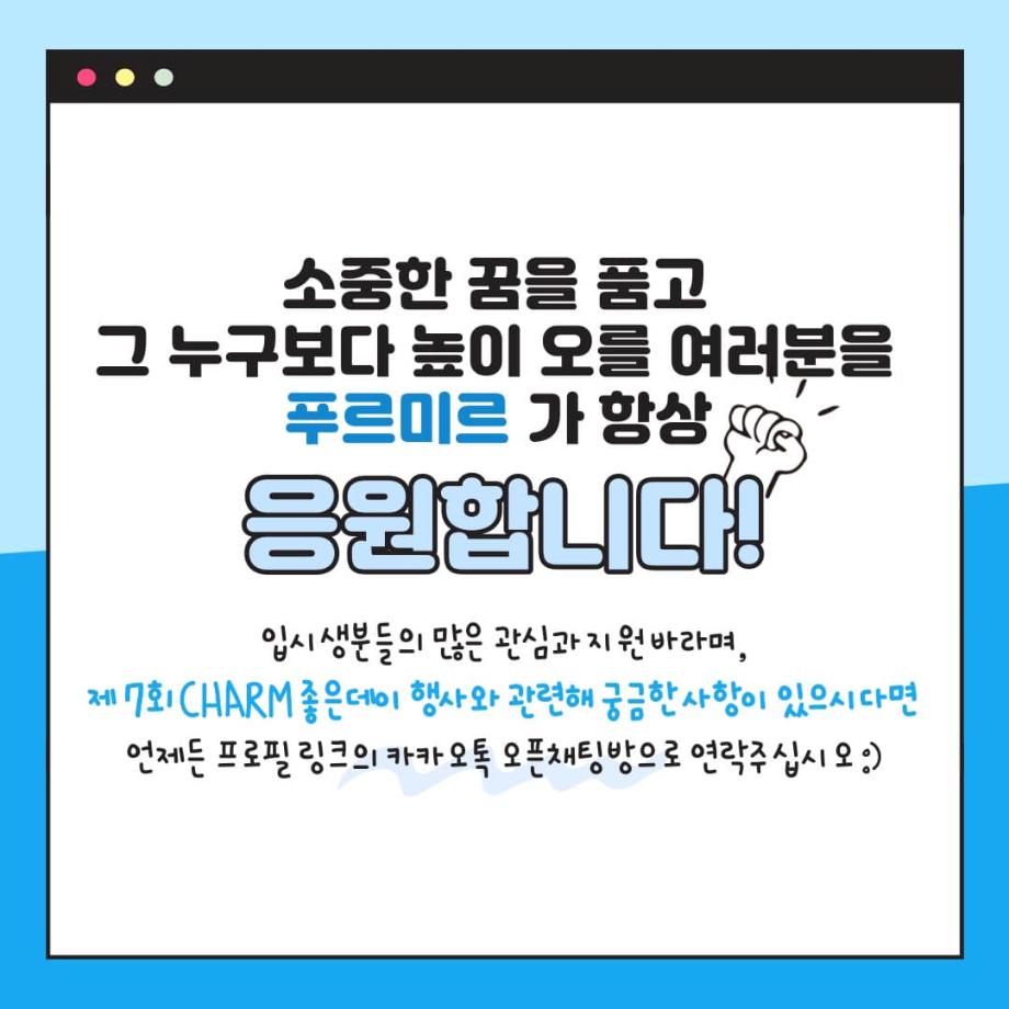 CHARM 좋은데이 접수기간이 4일밖에 남지 않았습니다 😀 입시생 여러분들의 많은 접수와 관심 부탁드리며, 궁금한 사항이 있으신분들은 언제든 💛카카오톡 오픈채팅방💛으로 편하게 연락주십시오 ◡̎