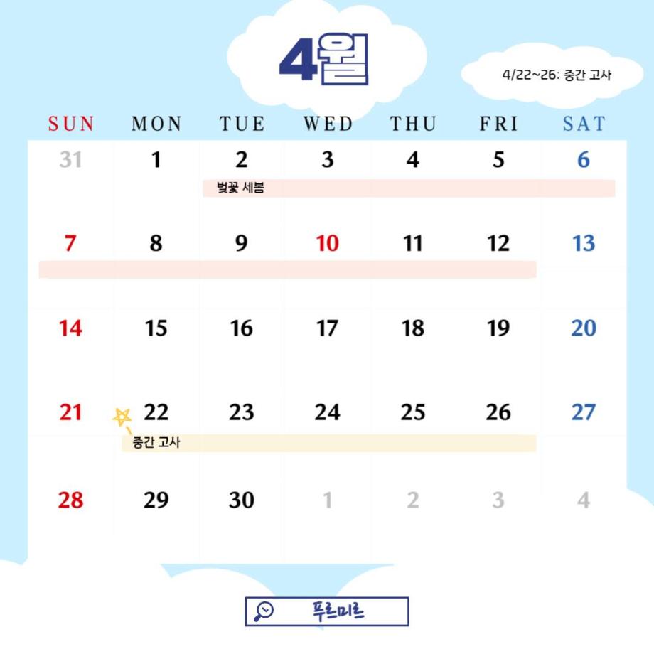 봄의 따스한 기운이 가득한 4월, 이번 달에는 세명대학교 벚꽃 축제와 중간 고사가 준비되어있습니다!!