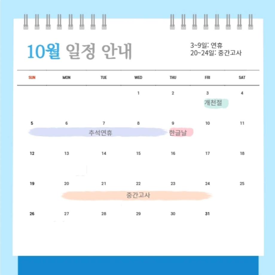 본문 시작 홈으로 커뮤니티 학과소개 입학정보 교과과정 커뮤니티 홈페이지가이드 포토갤러리 SNS 소통 공간 포토갤러리 공지사항 동아리 포토갤러리 페이스북 트위터 프린트 10월 다이어리 항공서비스학과 3741 2025-10-06 안녕하십니까 세명대학교 항공서비스학과 온라인 홍보국 💙푸르미르💙입니다. 10월에는 추석연휴와 중간고사가 있습니다! 확인하시고 일정에 착오 없으시길 바라겠습니다 😊 즐거운 연휴 보내세요🙇♂️ 소중한 꿈을 품고 그 누구보다 높이 오를 여러분을 저희 "푸르미르" 가 항상 응원하겠습니다 ✈💙 궁금한 사항이 있으시다면 언제든지 SNS로 연락 주십시오 💬 #세명대학교 #항공서비스학과 #세명대 #항공과 #푸르미르 #다이어리 목록 다음 제주항공 에듀윙 Advanced class 다음 가을 맞이 일상 사진