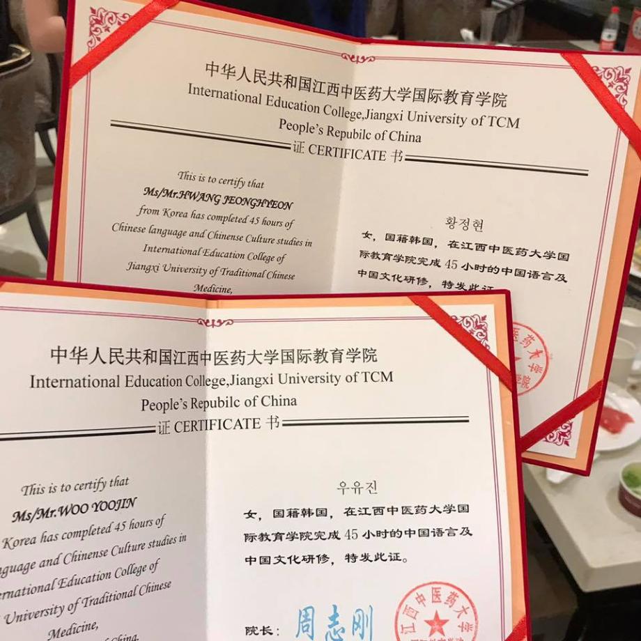 오후엔 , 강서중의대에서 준비 해주신 수료식을 가졌습니다 동기들 이름 한 명씩 호명되어 수료증을 받았습니다 호텔 뷔폐에서 맛있는 만찬도 준비 해주셔서 잊을 수 없는 수료식이 된 것 같습니다 수료증을 받으면서 난창에서 보냈던 일주일간의 시간들이 떠오르며 마지막이라는 생각에 아쉬운 마음도 많이 들었습니다