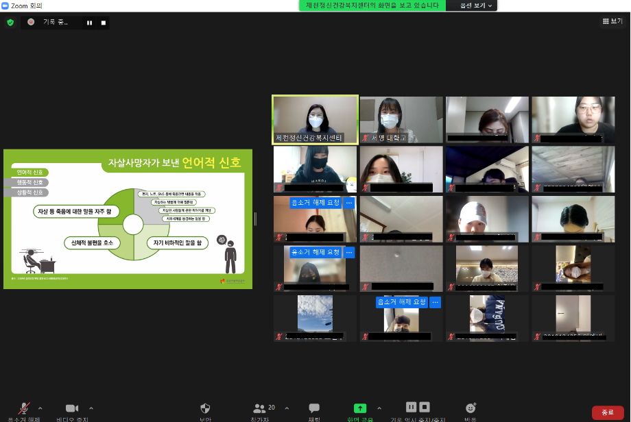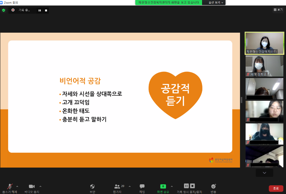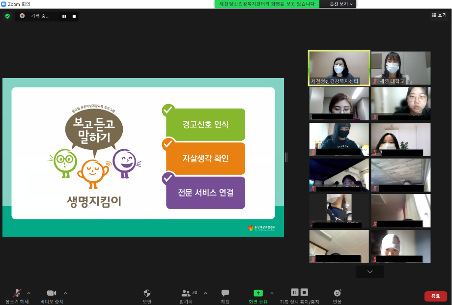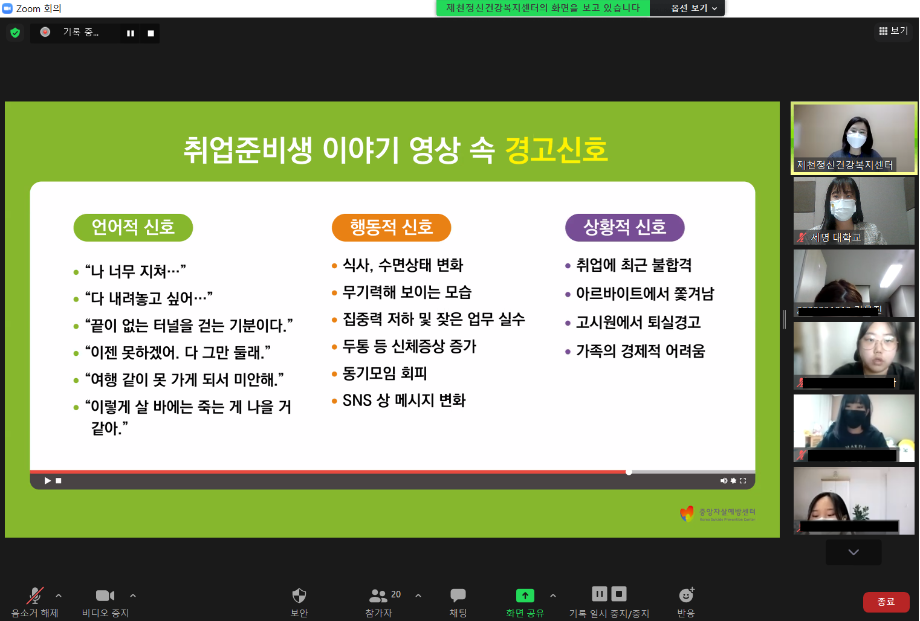 본문 시작 2021학년도 건강상담의 날 "자살예방교육"(10.26) 실시 CHARM케어상담센터 3595 2021-10-26 <건강상담의 날 "자살예방교육" 실시> 일시 : 10/26(화) 14:00~15:00 강사 : 제천시정신건강복지센터 팀장 신효진 목록 이전인권서포터즈 사회복지의날 캠페인 진행 다음 교내 폭력예방 캠페인 진행 담당부서 : CHARM케어상담센터 담당자 : - 연락처 : 043-649-1789 최종수정일 : 2024-10-26 만족도조사 만족도 조사 이 페이지에서 제공하는 정보에 대하여 만족하시나요? 매우만족 만족 보통 불만족 매우불만족