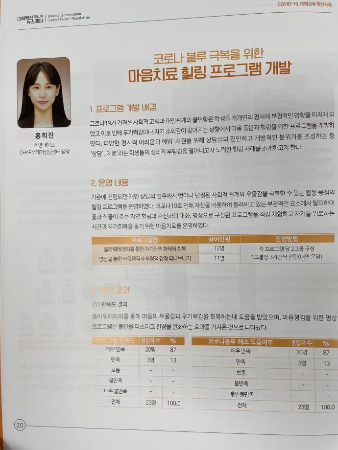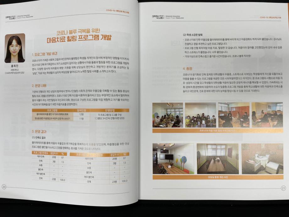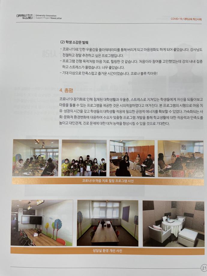 본문 시작 2021학년도 대학혁신지원사업 뉴스레터 6호 소식지 <코로나-19 마음치료 힐링 프로그램> 기재 CHARM케어상담센터 3443 2021-08-24 2021학년도 대학혁신지원사업 뉴스레터 6호 소식지에 <코로나-19 마음치료 힐링 프로그램>이 우수 프로그램으로 기재되었습니다. 목록 이전인권서포터즈 노인학대예방의날 캠페인 다음 인권서포터즈 사회복지의날 캠페인 진행 담당부서 : CHARM케어상담센터 담당자 : - 연락처 : 043-649-1789 최종수정일 : 2024-10-26 만족도조사 만족도 조사 이 페이지에서 제공하는 정보에 대하여 만족하시나요? 매우만족 만족 보통 불만족 매우불만족
