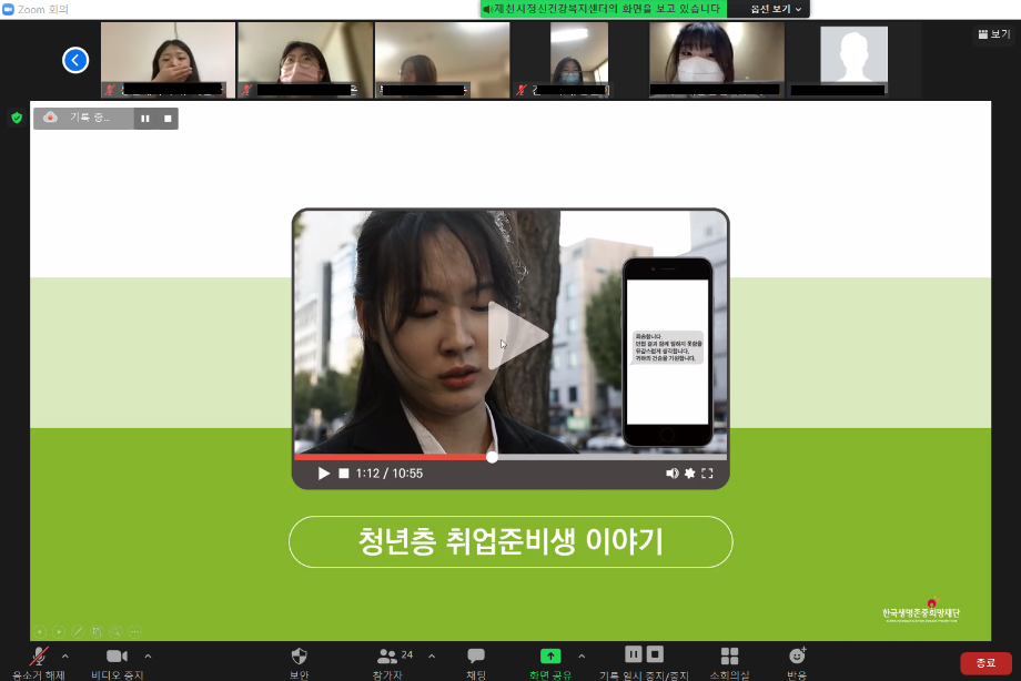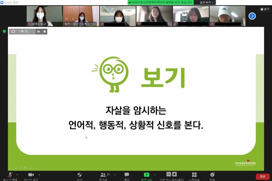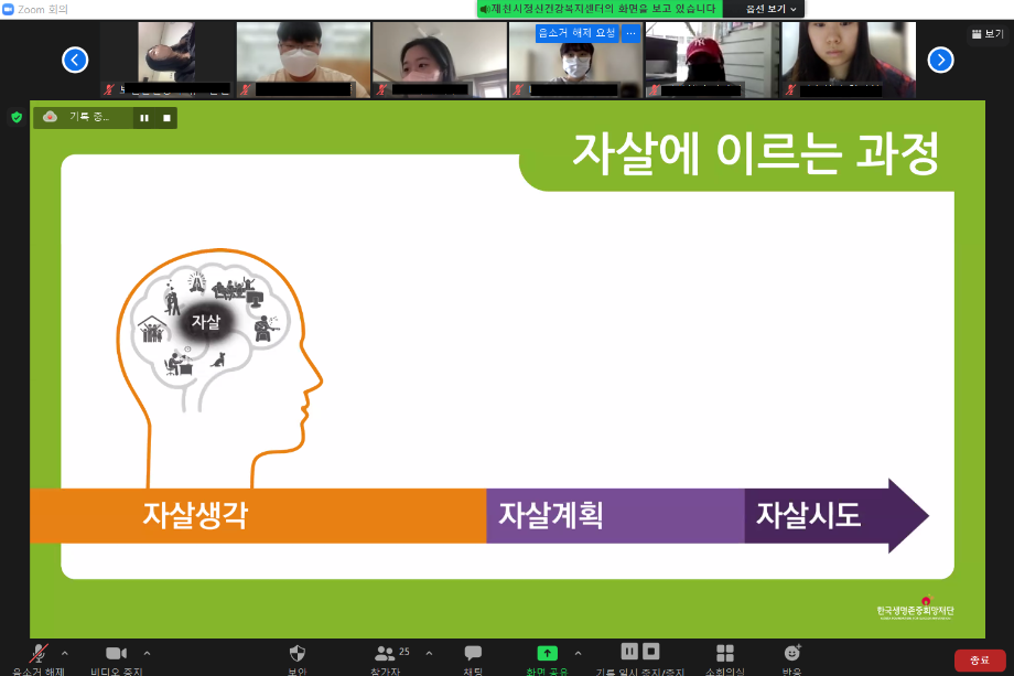 본문 시작 2022학년도 건강상담의 날 "자살예방교육"(05.11) CHARM케어상담센터 3696 2022-05-11 2022학년도 1학기 두번째 건강상담의 날 "자살예방교육"(2022.05.11) 목록 이전2022학년도 1학기 청년 대상 "방방곡곡" 마음안심버스 운영 이전2022학년도 CHARM케어상담센터 교내 캠페인 담당부서 : CHARM케어상담센터 담당자 : - 연락처 : 043-649-1789 최종수정일 : 2024-10-26 만족도조사 만족도 조사 이 페이지에서 제공하는 정보에 대하여 만족하시나요? 매우만족 만족 보통 불만족 매우불만족