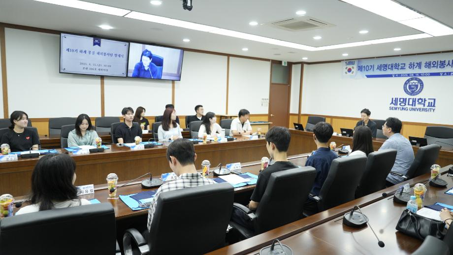 본문 시작 Photo SMU 세명소개 입학/취업 대학/대학원 학사지원 대학생활 연구/산학 기관/시설 SMU Story 소통·공감 학교기업 홈페이지가이드 학생활동 News@SMU 공지사항 보도자료 Photo SMU Media SMU 민송백일장 해카톤 경진대회 학생활동 페이스북 트위터 프린트 2025 제10기 세명대학교 하계 해외봉사단 발대식 홍보센터 2426 2025-08-15 2025 제10기 세명대학교 하계 해외봉사단 발대식 목록 이전밀어주는 위원회 제4회 무소출정식 이전2024 후기 학부 및 대학원 학위수여식 담당부서 : 홍보센터 담당자 : 홍보센터 연락처 : 043-649-1175 최종수정일 : 2024-10-26 만족도조사 만족도 조사 이 페이지에서 제공하는 정보에 대하여 만족하시나요? 매우만족 만족 보통 불만족 매우불만족