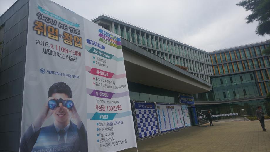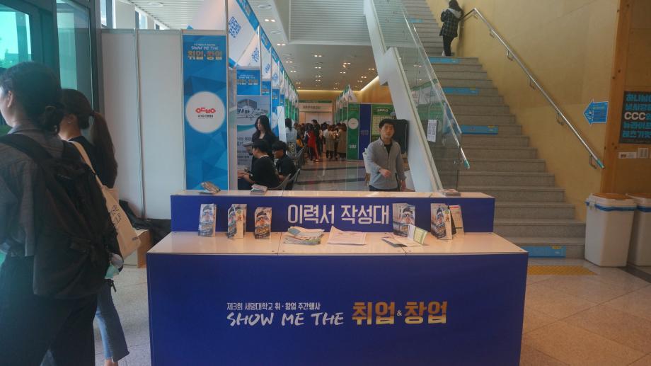 본문 시작 Photo SMU 세명소개 입학/취업 대학/대학원 학사지원 대학생활 연구/산학 기관/시설 SMU Story 소통·공감 학교기업 홈페이지가이드 학생활동 News@SMU 공지사항 보도자료 Photo SMU Media SMU 민송백일장 해카톤 경진대회 학생활동 페이스북 트위터 프린트 제3회 세명대학교 취창업주간행사 기획실 7025 2018-09-13 제3회 세명대학교 취창업주간행사 세명대학교 재학생의 취업과 창업 역량강화를 위한 행사이다. 취업과 창업을 위한 특강 및 설명회가 현장에서 진행되며 실제 기업 인사 담당자가 참가하는 채용부스도 운영한다. 그 외에도 면접 메이크업, 이력서 사진촬영, 인적성 검사 등 다채로운 부대행사도 지원한다. 목록 이전제28회 청룡축전 다음 중국어 시 낭송 대회 담당부서 : 홍보센터 담당자 : 홍보센터 연락처 : 043-649-1175 최종수정일 : 2024-10-26 만족도조사 만족도 조사 이 페이지에서 제공하는 정보에 대하여 만족하시나요? 매우만족 만족 보통 불만족 매우불만족