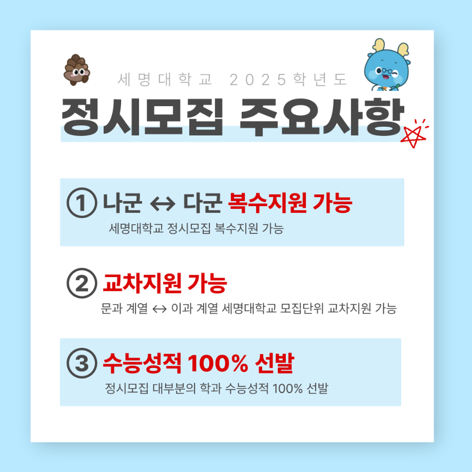 본문 시작 홈으로 커뮤니티 대학소개 학과소개 입학안내 커뮤니티 홈페이지가이드 포토갤러리 대학소식 학과소식 자료실 포토갤러리 포토갤러리 페이스북 트위터 프린트 2025학년도 정시모집 안내 IT엔지니어링대학 1981 2024-12-30 [입학안내 바로가기] 목록 이전수시모집 충원합격자 발표/등록 안내 다음 [KT희망나눔재단] 2025년 KT디지털인재장학생 선발 안내 담당부서 : AI융합대학 담당자 : - 연락처 : 043-649-7422 최종수정일 : 2024-10-26 만족도조사 만족도 조사 이 페이지에서 제공하는 정보에 대하여 만족하시나요? 매우만족 만족 보통 불만족 매우불만족