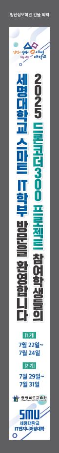 2025 드론코더300 프로젝트의 충청북도교육청에서 주최하고, 세명대학교 IT엔지니어링대학과 스마트IT학부에서 주관하는 프로그램으로 드론 조종, 드론 코딩, 자율주행차 아두이노 코딩 3개 영역 총 20시간으로 구성되었으며, 세명대학교 스마트IT학부 한상익 교수가 교육을 총괄하였고 재학생 6명이 보조 교사로 참여하였다. 참여 학생들은 드론 조종 시뮬레이터를 활용하여 조종 실습을 해보고, 유소년 축구 드론을 이용하여 실제 드론 조종 경험을 해볼 수 있었다. 스크레치 코딩으로 드론이 다양한 모양을 그리며 비행하고 LED 모듈에 원하는 그림도 코딩으로 그려보았으며, C언어를 이용하여 자율주행차가 주어진 경로를 주행할 수 있게 코딩하는 시간을 가졌다. 보조 교사 1명이 3~4명의 학생을 담당하여 교육의 질을 향상할 수 있었다.